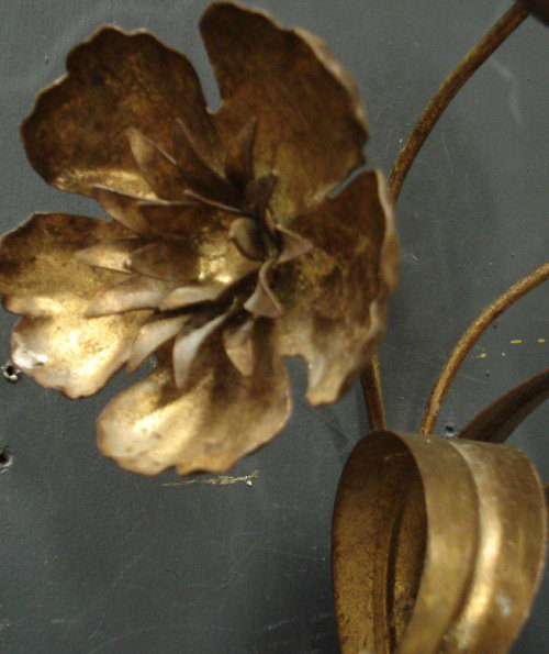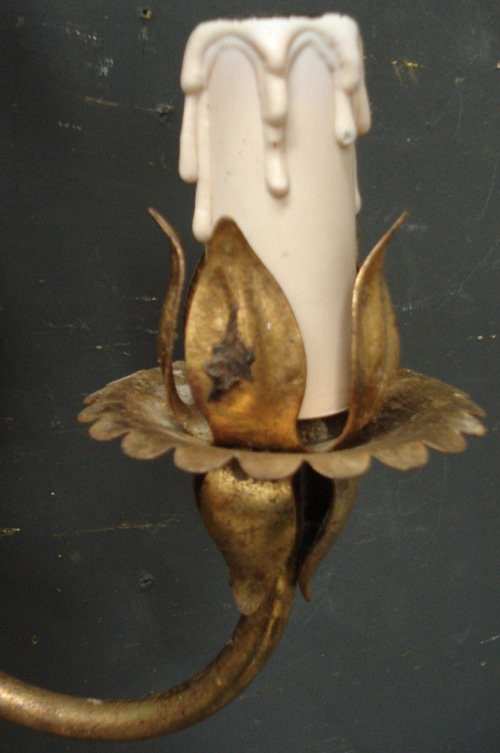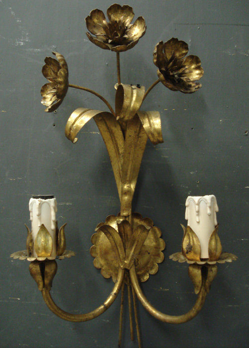 Ref 3740 - Pair of Italian gilt painted metal 2 arm wall lights with flower and leaf decoration. Original wiring needs checking.