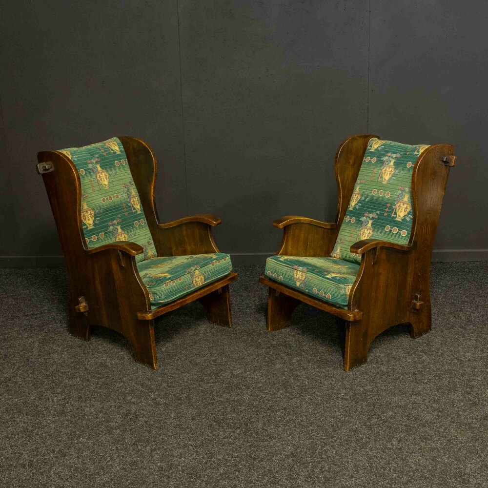 A great pair of Lancashire 'Lambing' chairs from the early 20th century. Solid oak in construction with pegged sides and extremely solid. Just back from the upholsterers and looking great in their patterned velvet attire. Very comfortable and in super condition ready to use and enjoy.