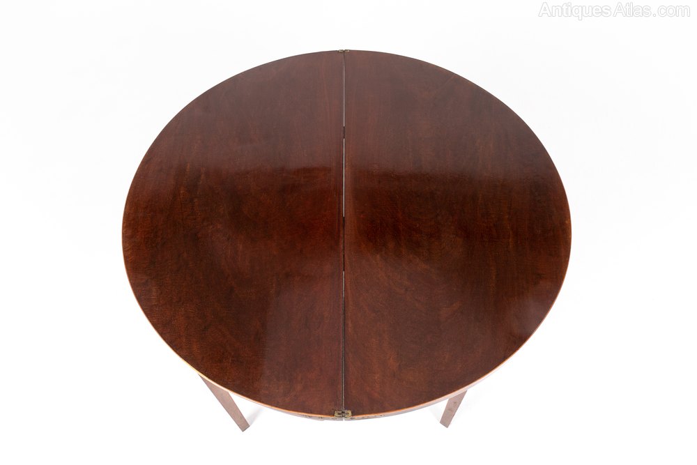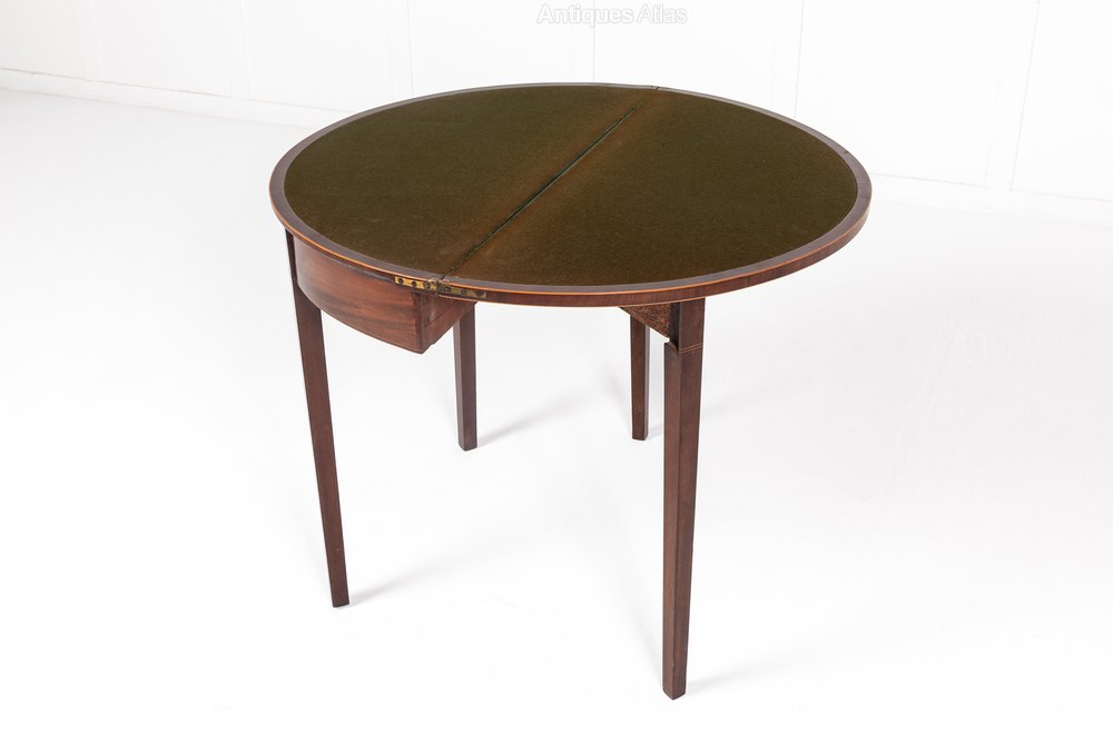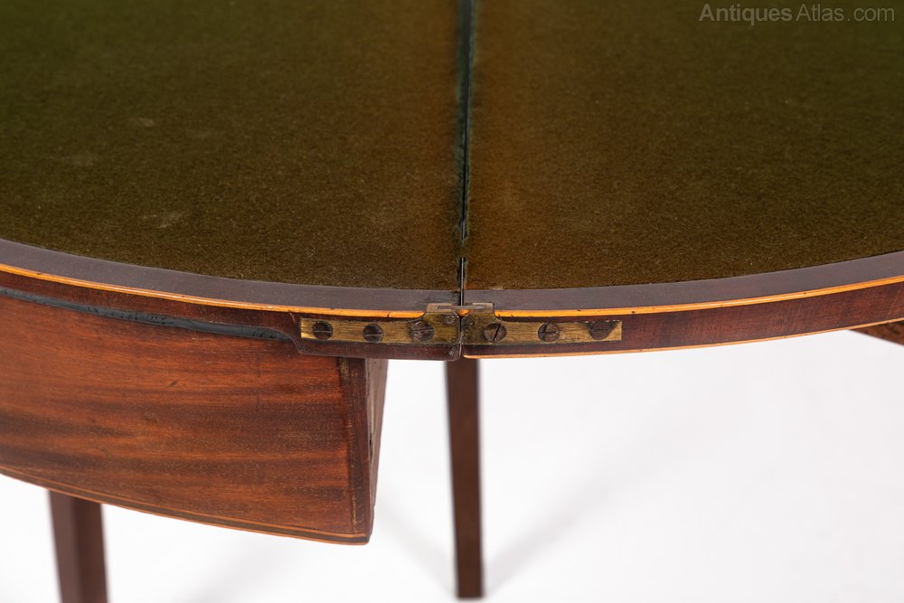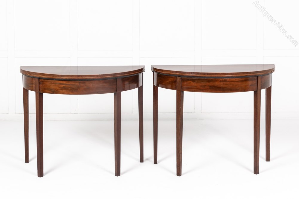 A handsome pair of late 18th Century English, mahogany demilune card/tea antique tables. One table has its original green baize on the open surface and the other is mahogany veneered. The bow front edges and the bottom of the frieze have fine lines of satinwood stringing. Supported by elegant square tapering legs.