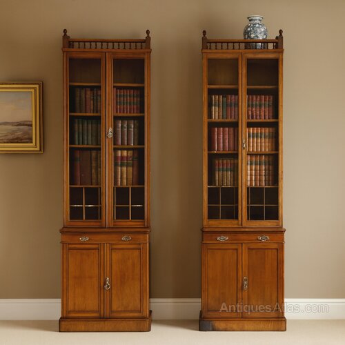 Fitted with similar brass handles to each bookcase and with working locks. In good condition with some chips to the sides of the top, one plinth corner with dark mark and bubbles to veneer but can arrange to be restored. Overall an attractive rare pair of slender bookcases with Aesthetic Movement influence, possibly made by Gillows or Waring & Gillows incorporating elements from their work with Bruce Talbert.