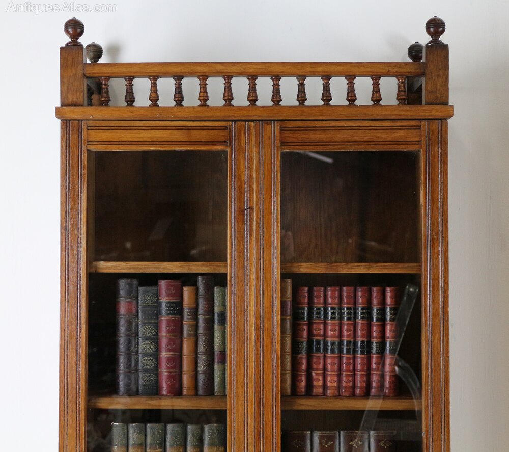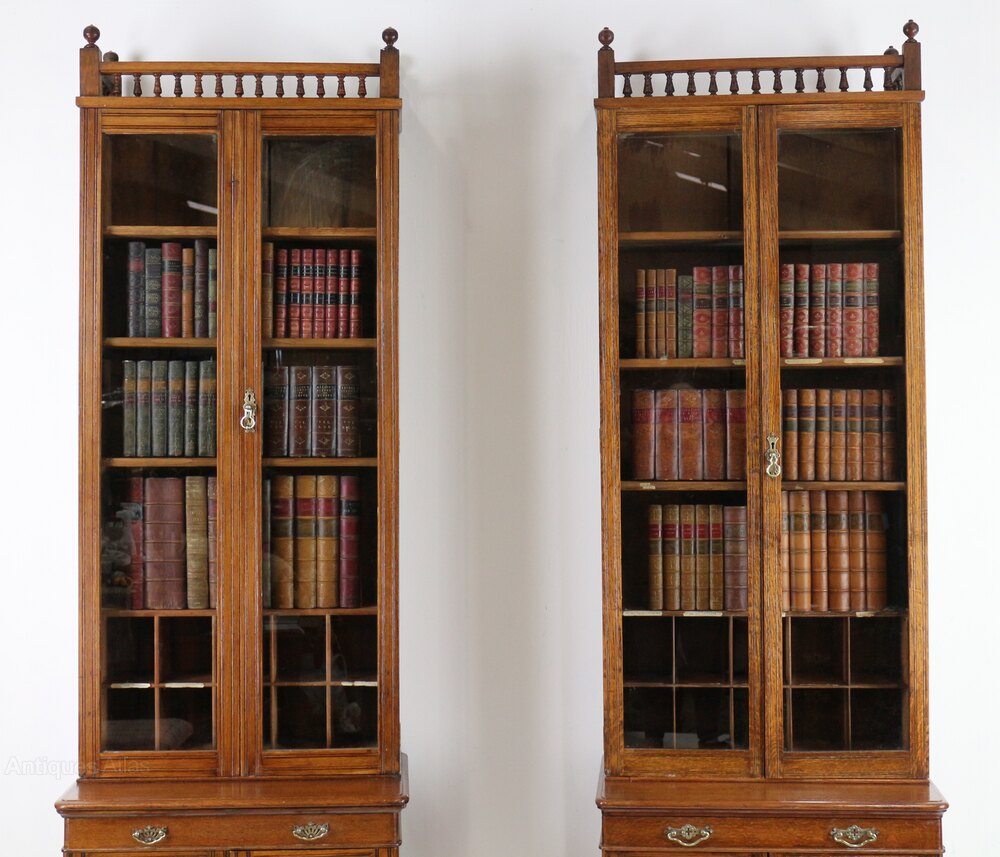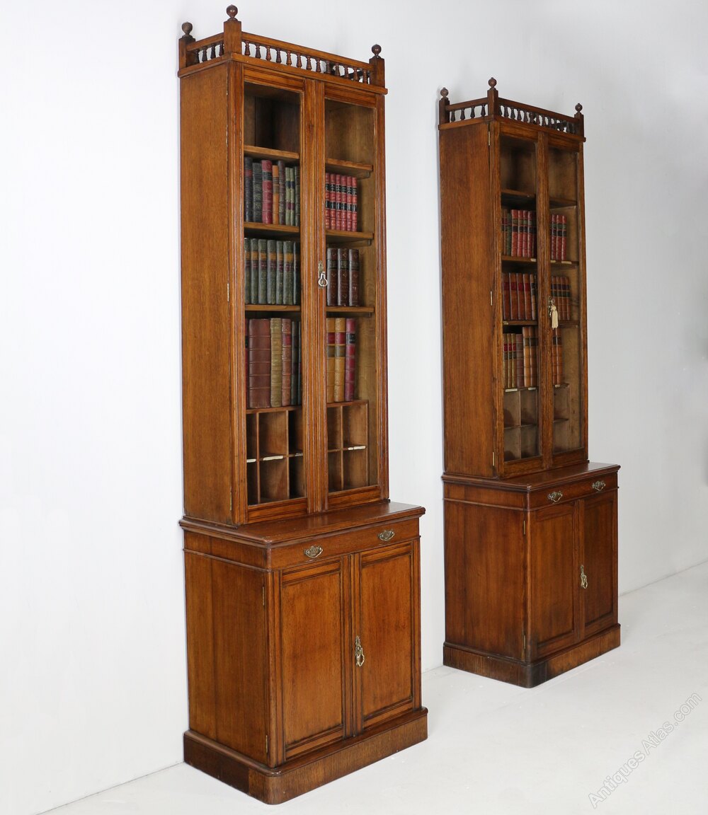 A narrow pair of golden oak estate bookcase cabinets dating to the last quarter of the 19th century. The tops with a spindle gallery flanked by ball finials above a pair of glazed doors, the bases with a single drawer above a pair of panelled cupboard doors, with tramline reeded decoration to door surrounds and all standing on a plinth base. The upper sections each with three removable shelves above pigeon holes and the bases with a removable shelf.