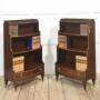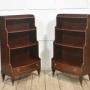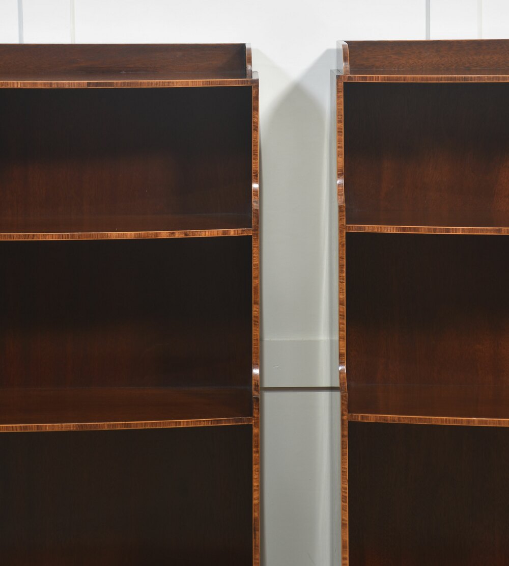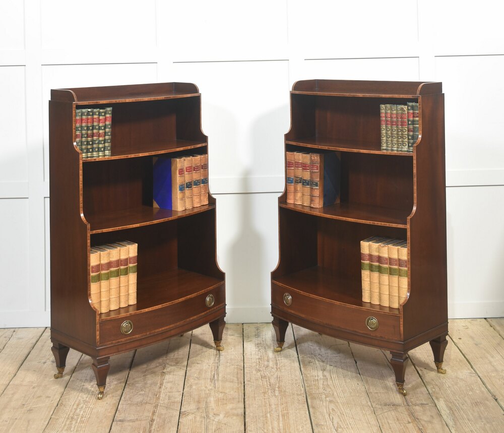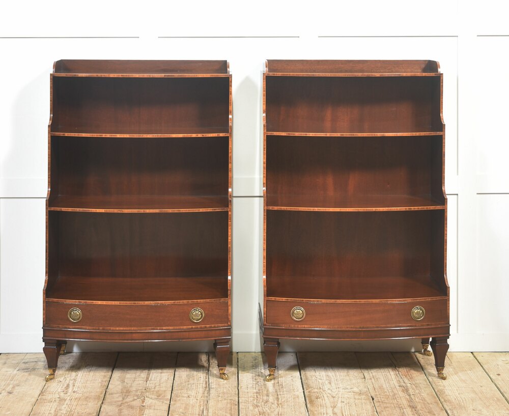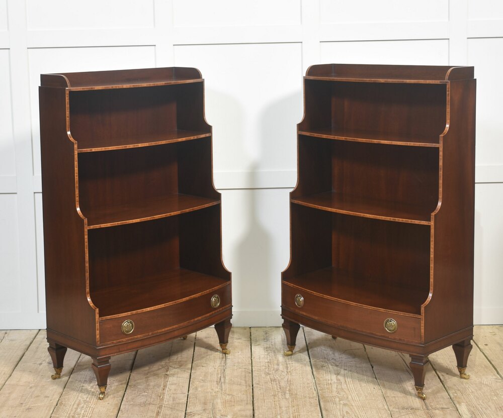 A handsome pair of mahogany waterfall bookcases. Each piece is designed with three graduated open shelves, their sides gently shaped in the classic waterfall style, above a bow-front drawer fitted with brass ring-pull handles. The rich mahogany is enhanced by fine crossbanded inlay to the shelf edges, giving an elegant contrast. Standing on tapered legs with brass castors, these bookcases are both refined and practical, perfect for books or display.