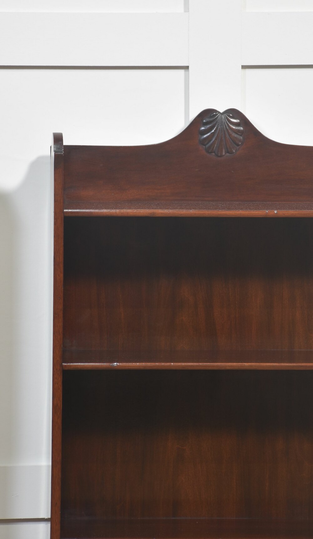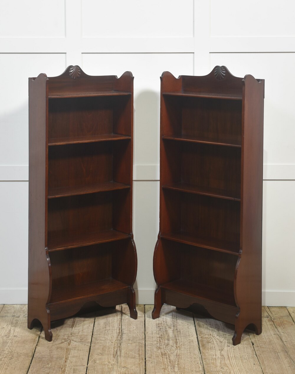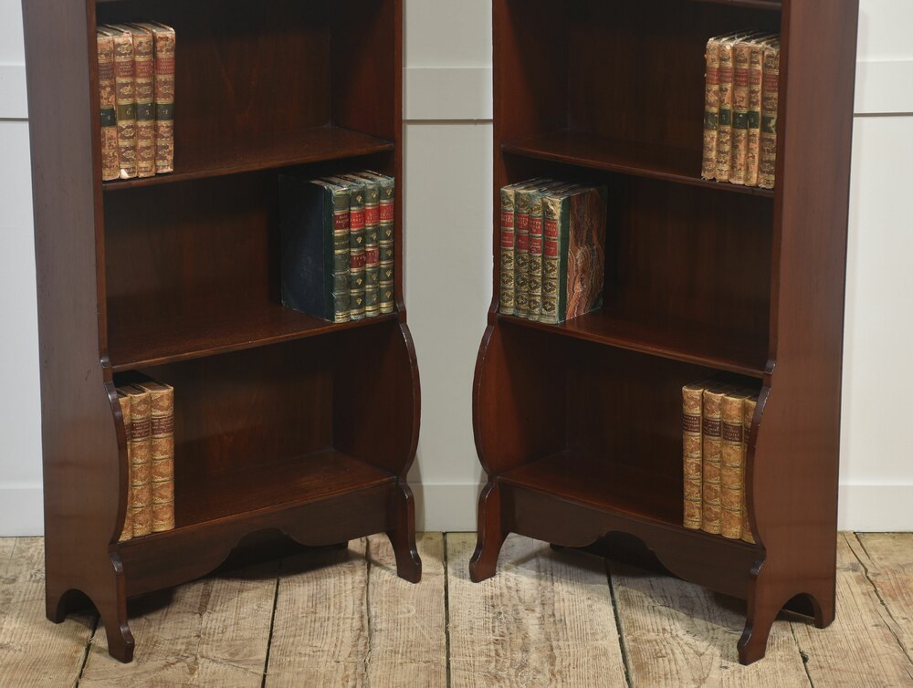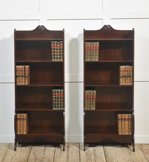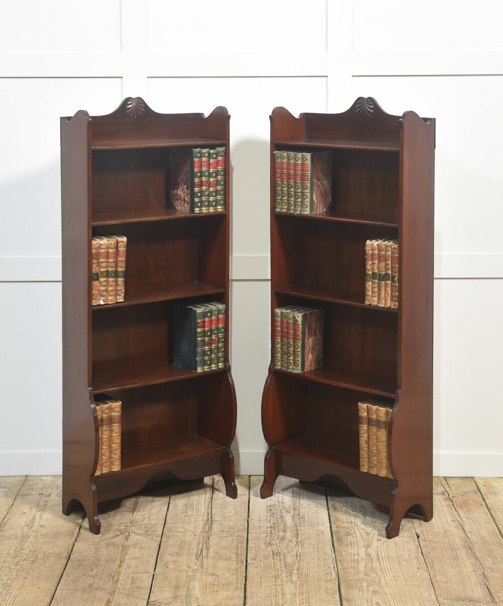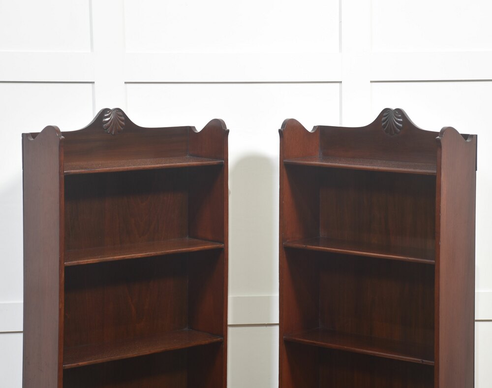This elegant pair of mahogany open bookcases showcases timeless craftsmanship and classic design. Each bookcase features four fixed shelves, providing ample space for displaying books or decorative items. The rich mahogany finish highlights the fine grain of the wood, while the shaped apron and gently curved sides add refined character. At the top, a hand-carved shell motif offers a subtle decorative flourish typical of traditional English furniture.