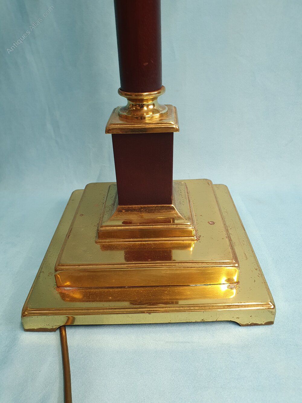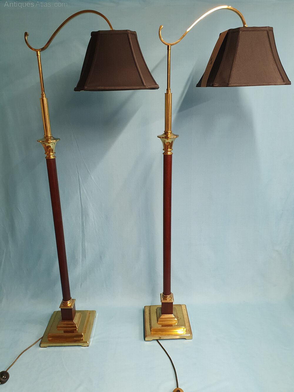 "This pair of standard lamps have square brass bases tapering up which are weighted to create stability. Coming up from this there is a mahogany column, going into the brass section at the top holding the black shaped shade. As you can see in the pictures there is a small amount of tarnishing here and there on the bases. I felt it added to the character of the lamps. I would be happy to get them polished if you would like. Lamp height 152 cm length width including the shade 33 cm lamp depth including the shade 60 cm the shade is 33 cm wide the base is 25 cm wide. These standard lamps come with cable 1.7 m long. They have large bayonet bulb holders B 22.