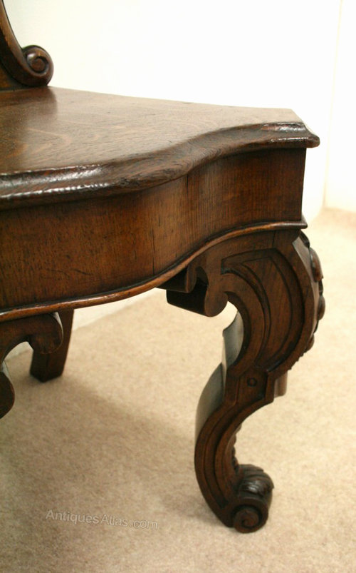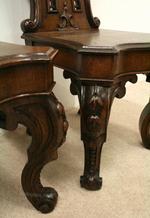 Circa 1880, impressive pair of mid Victorian oak hall chairs, the shield shaped backs with fretted floral decorations and a carved cartouche, a serpentine seat, standing on bold carved cabriole supports.