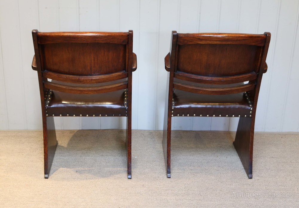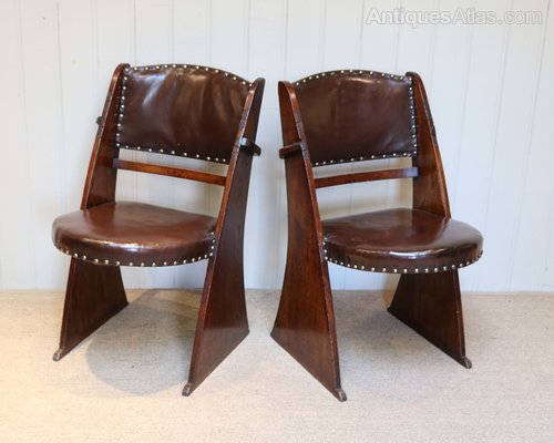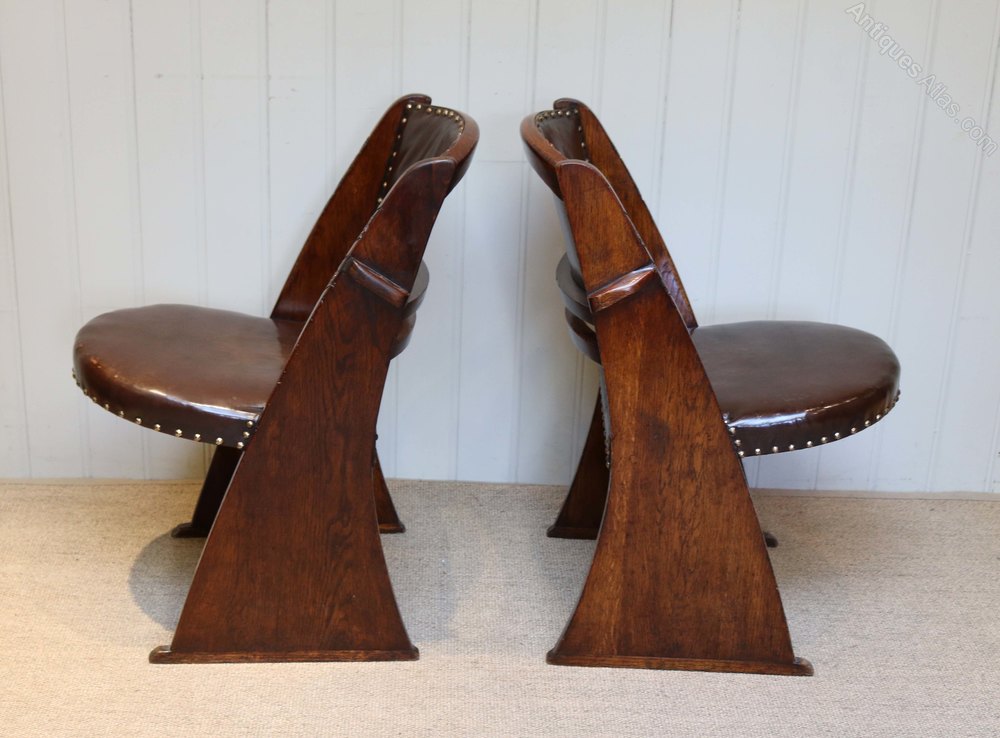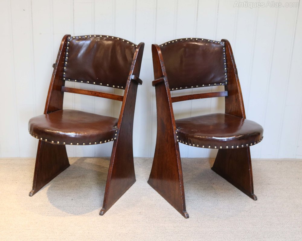 Pair of oak Art Deco chairs in an odeon style having leather studded seats and back with shaped oak frames having carved edges. Would split