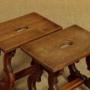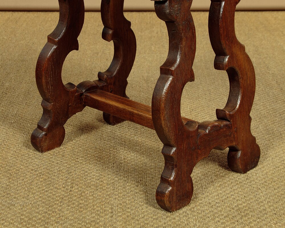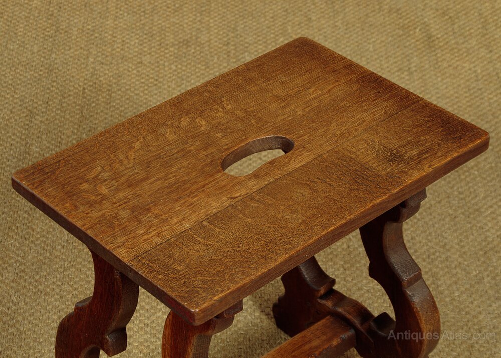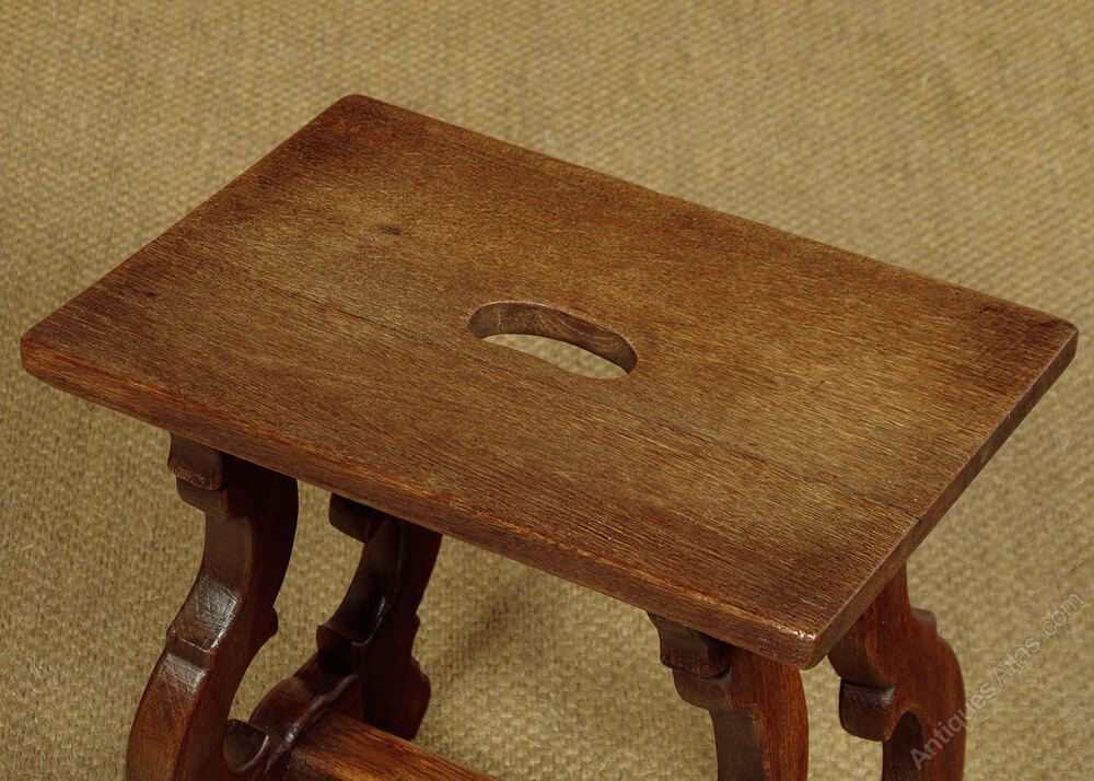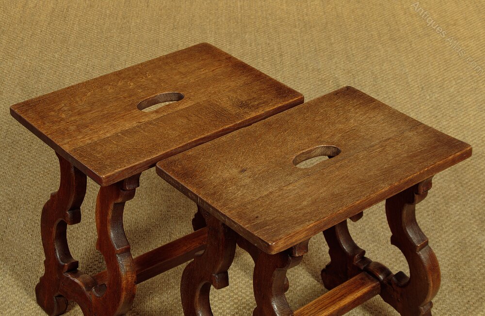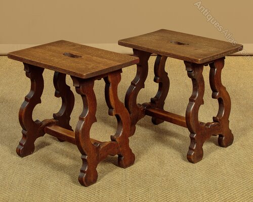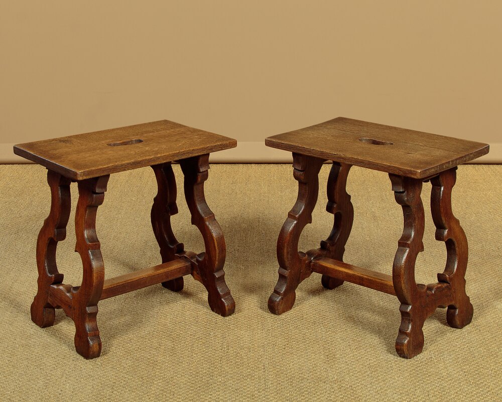 Useful pair of oak stools c.1930. Could also be used as low side tables. 18½" x 12½" tops with pierced hand grips. Very attractively shaped legs, splayed for stability and joined with a middle stretcher for strength. Excellent condition, cleaned and waxed in our workshops.