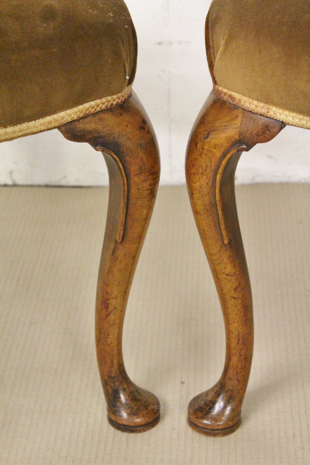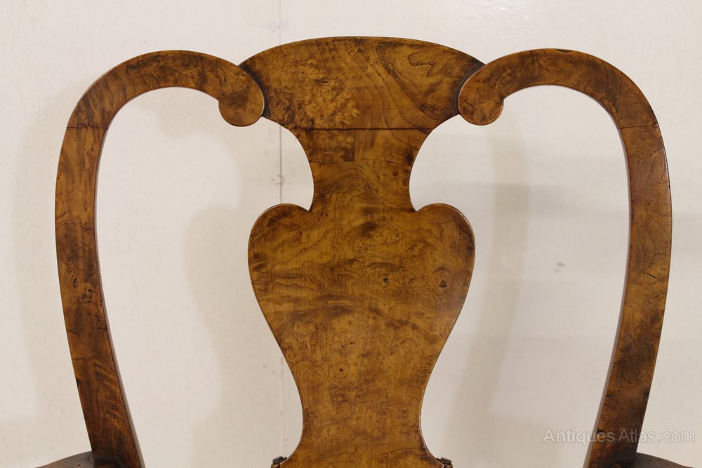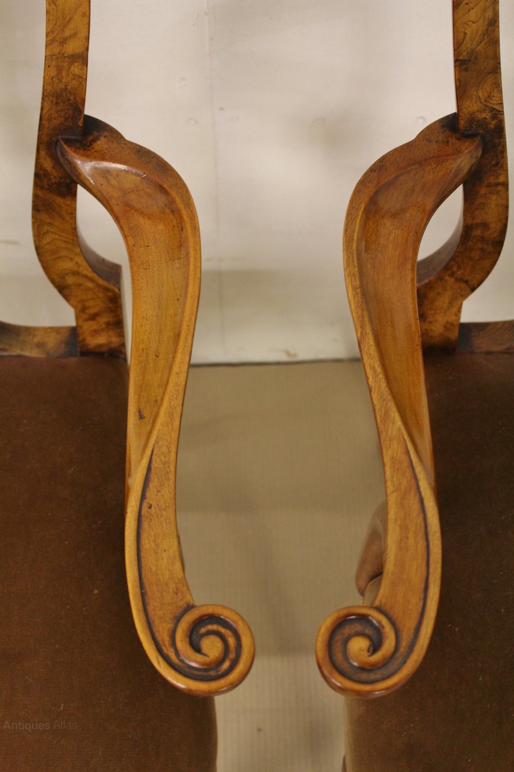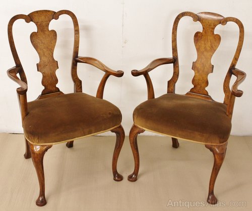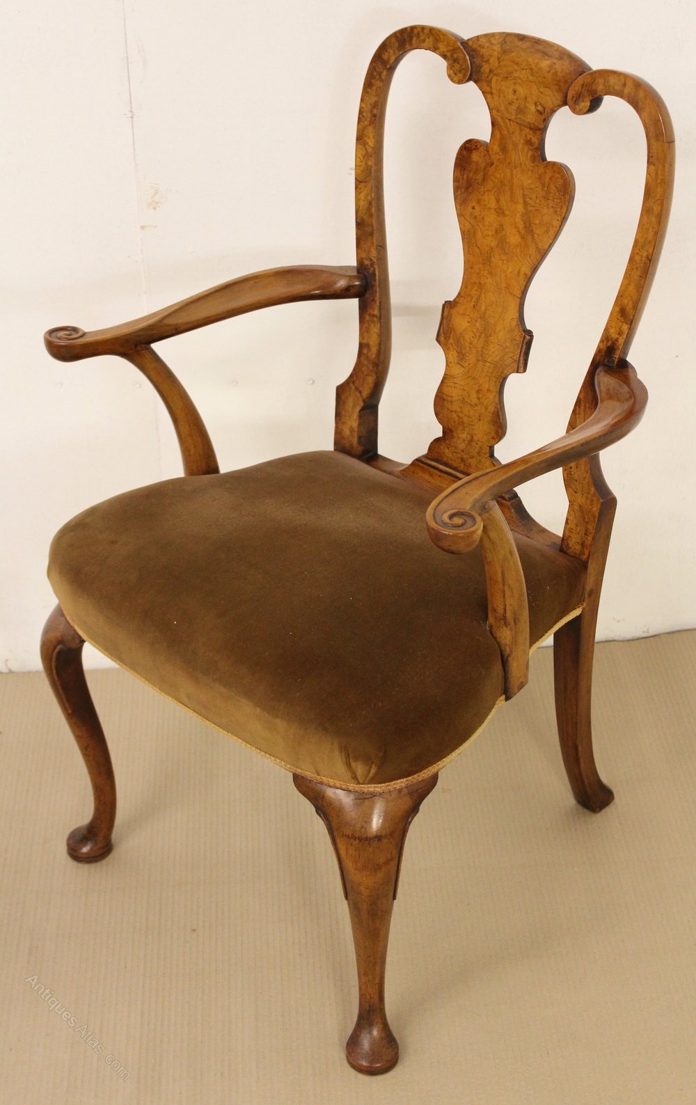 A very good pair of late 19th century armchairs in the Queen Anne style. Made from a good grade of solid walnut timber and attractive burr walnut veneers, now with a great depth of colour and patina. The vase shaped back splats are in burr walnut and are eye-catching. The scrolling arms, have carved detailing, a lovely feature. The elegant legs are sturdy and the chairs sit true, free from any wobbles. The upholstery is in very serviceable condition and the chairs are very comfortable to sit in. These charming chairs would work well in a number of different room scenarios of the modern home. They are offered for sale in excellent, original condition.