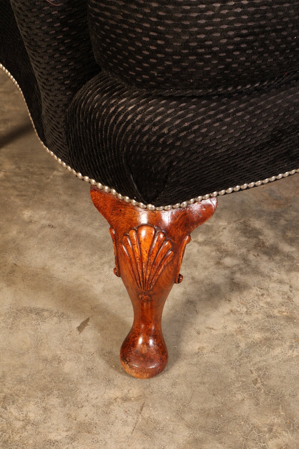 Upholstered in a very dark green/black fabric with chrome studded trim, again in very good clean condition.