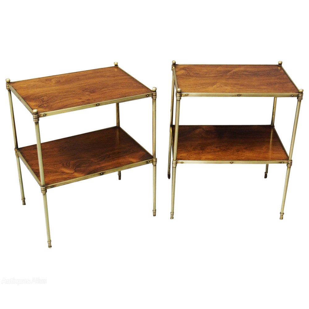 Circa 1930, pair of cast brass and rosewood 2 tier etageres. The rosewood tops are contained in a brass frame, which continues down to form the uprights, which hold the tiers together and are topped by a circular finial. The sturdy legs finish with a small ring turning.