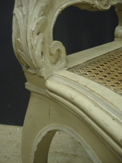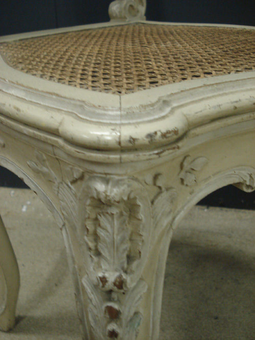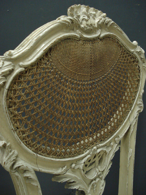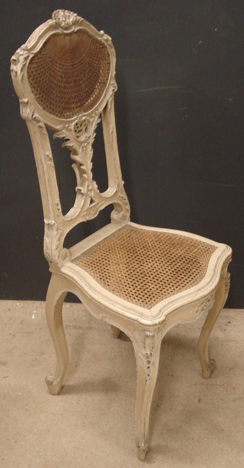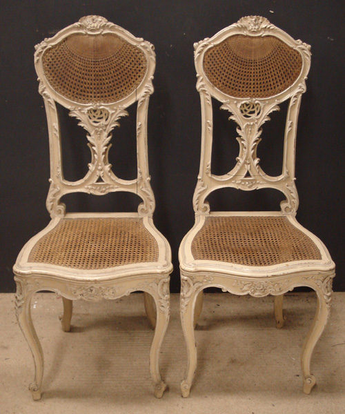 Ref 3267 - Pair of old dirty white painted carved wooden side chairs with cane backs and seats. c.1900.