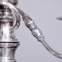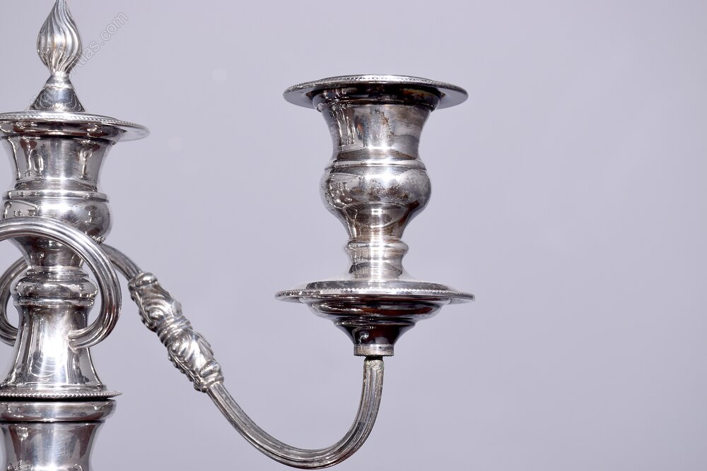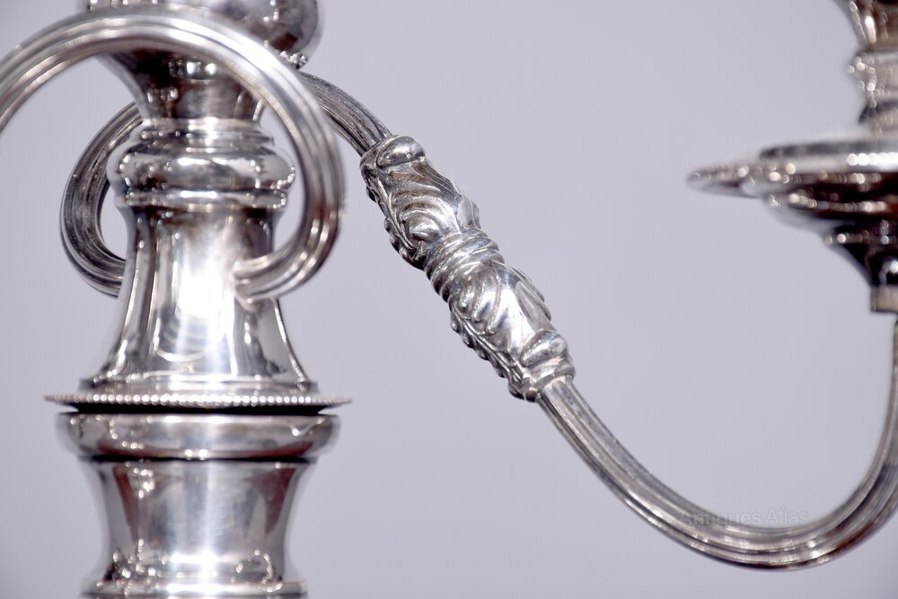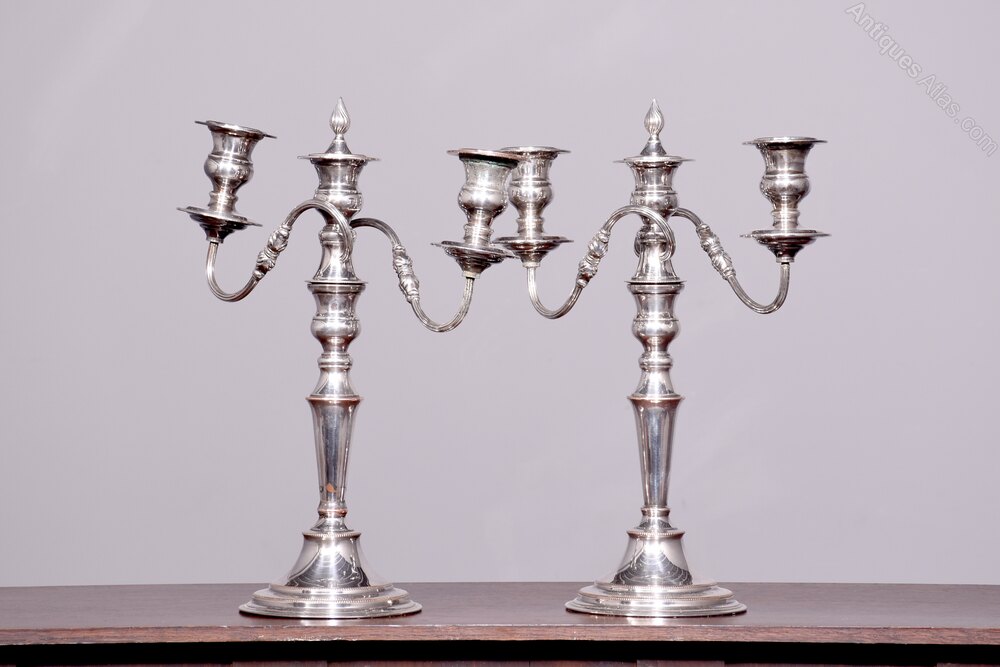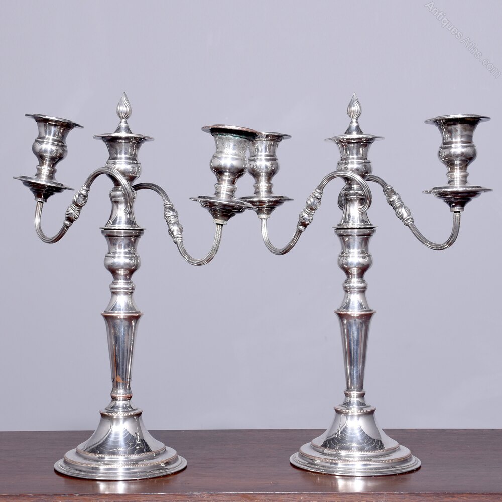 Circa 1890. A pair of Electroplated Nickel Silver (EPNS) candelabra, the central turned stem surmounted by a removable finial, the edges with fine decoration, issuing two shaped arms which support two candle holders with similar drip trays and removable nozzles, the candelabra can be used in 3 combinations