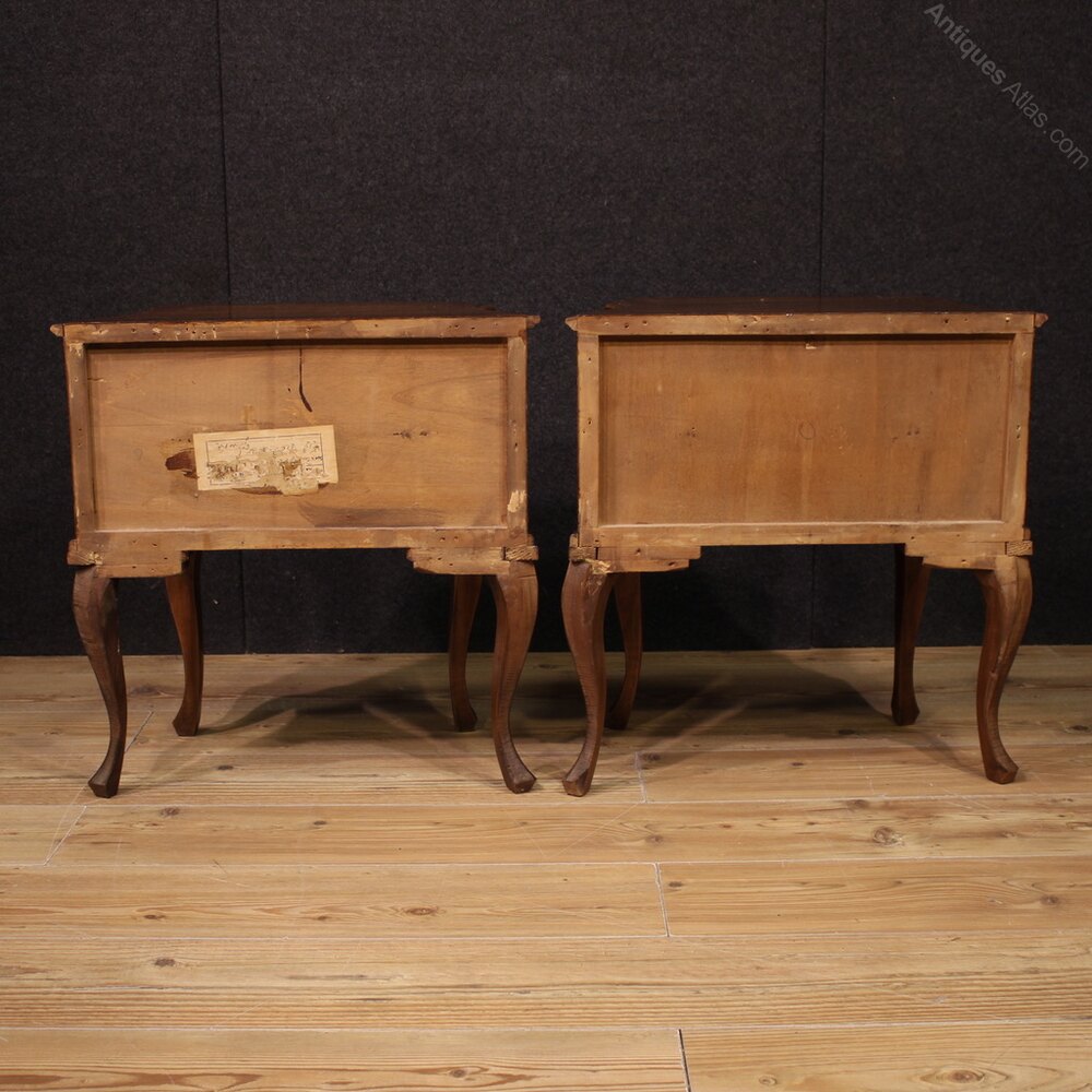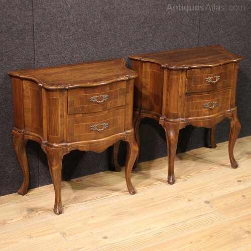A pair of Venetian bedside tables from the mid-20th century. Furniture of small dimensions, each with two drawers, are veneered in walnut and maple. These tall-legged tables, complete with a wooden top, are of a discreet size and practicality. These attractively decorated bedside tables are ideal for a bedroom or living room, and are ideal for antique dealers and interior decorators. The night stands, with curved fronts and sides, are supported by beech legs, offering good solidity and stability. In good condition.