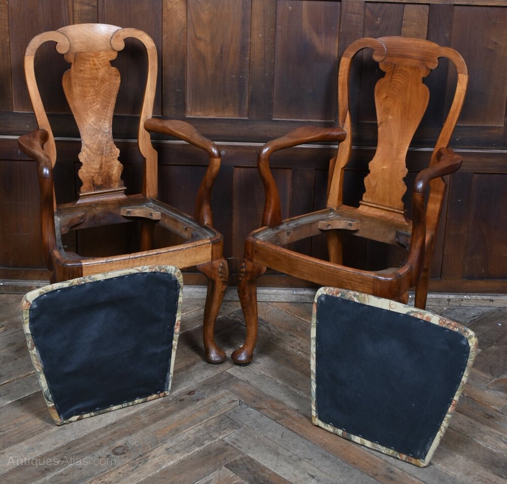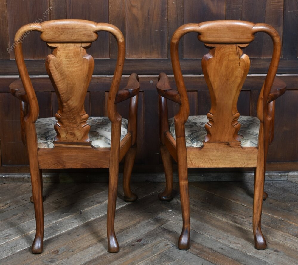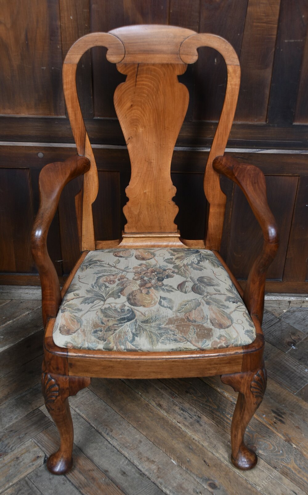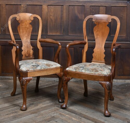A fantastic pair of Victorian walnut open armchairs, each showcasing a well-proportioned back with shapely splats and a gently curved top rail. The shepherd’s crook-style arms flow gracefully from the uprights, framing the seat with elegance and poise. Standing on carved cabriole forelegs with padded feet and splay legs to the rear, these chairs offer both decorative charm and practical stability. Upholstered in a classic floral tapestry that is clean and well-maintained, the seats could be easily re-covered to suit any interior scheme. As with all antiques, there are minor imperfections that speak to their age, but the chairs remain solid and sound. The warm tones of the walnut enhance the rich grain, making them a refined addition to any drawing room, study, or period desk setting.