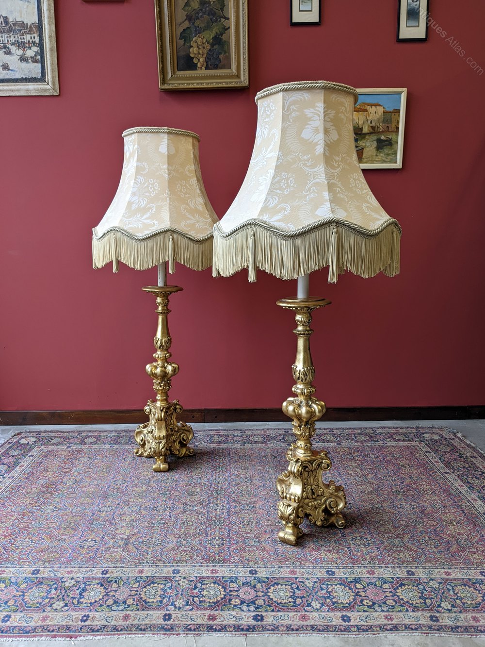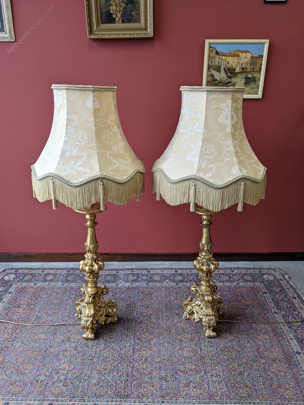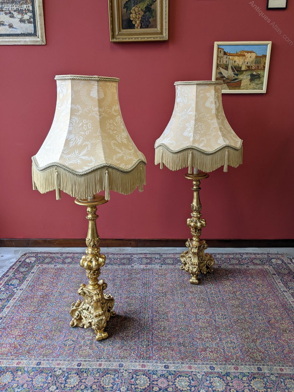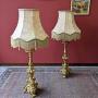 A fine pair of neoclassical gilt plaster floor standing lamps. The lamps each feature a single large ornately shaped column above a scrolled tripod base, with candle light fittings and large oversized drop on shades.