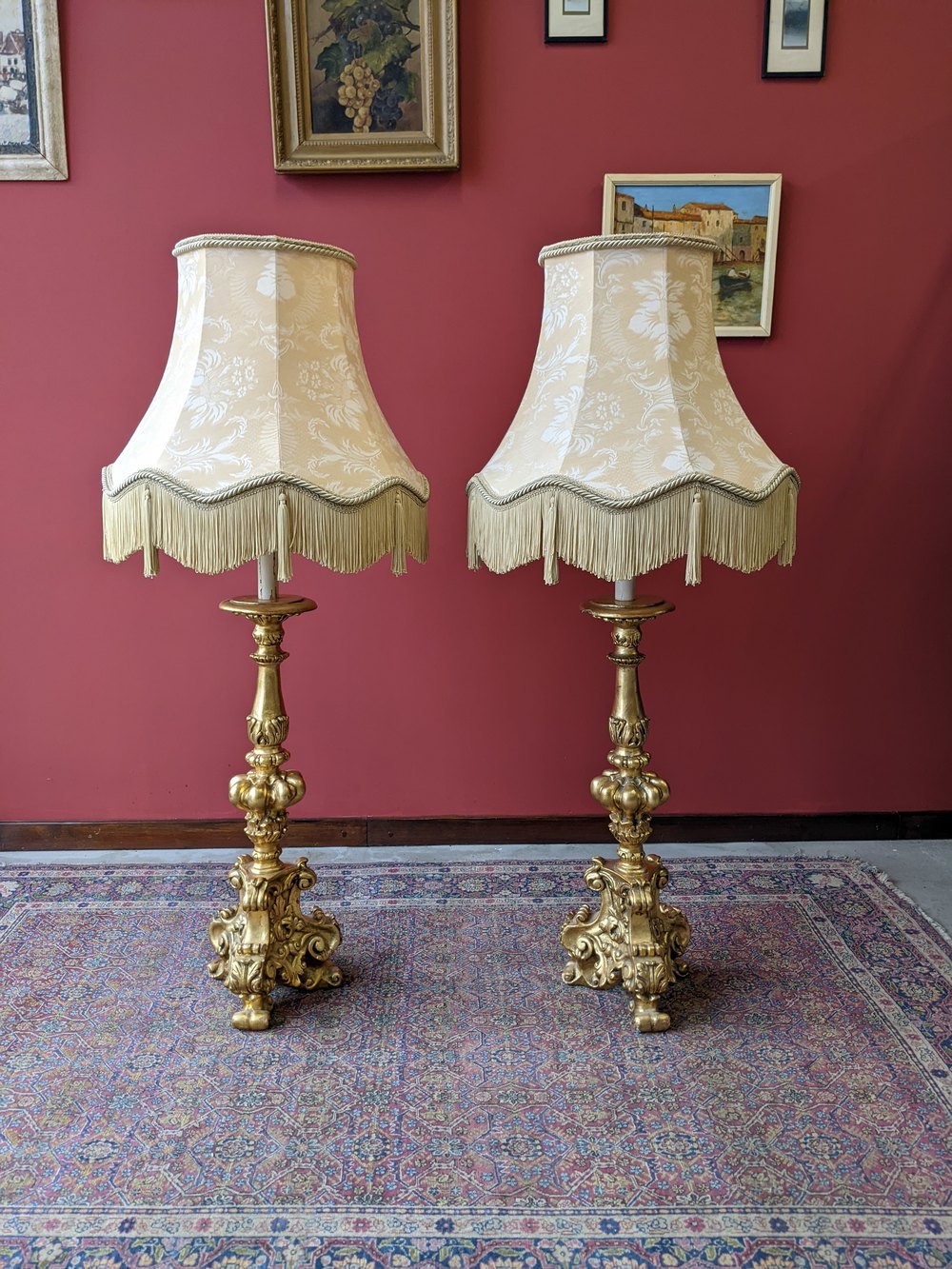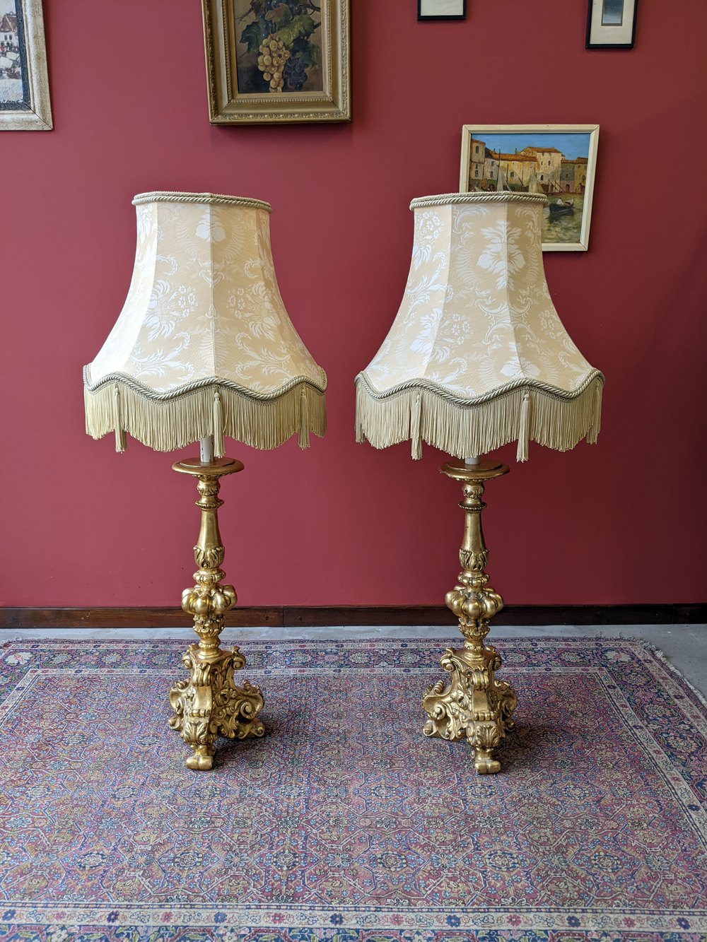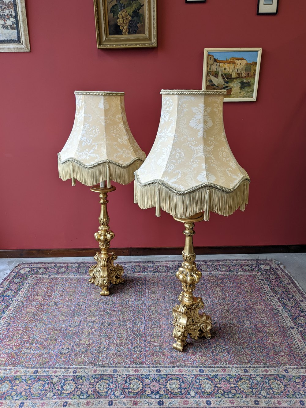 A fine pair of neoclassical gilt plaster floor standing lamps. The lamps each feature a single large ornately shaped column above a scrolled tripod base, with candle light fittings and large oversized drop on shades.
