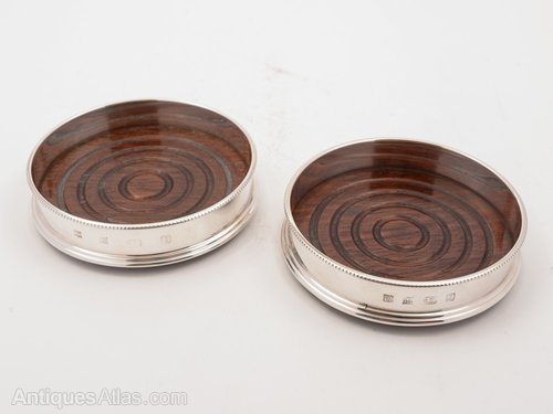 A lovely pair of English vintage silver wine coasters with turned hardwood bases and plain silver sides. Hallmarked Birmingham 1992 and marked 'P H V & Co' for maker P H Vogel & Co.