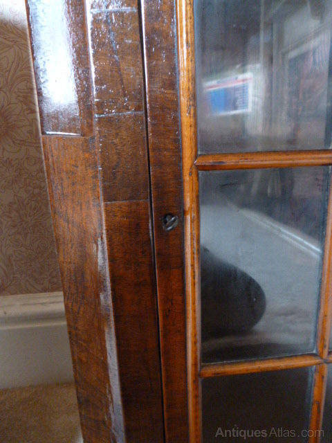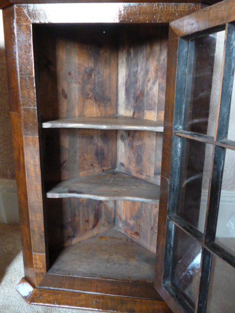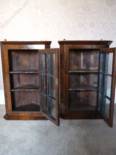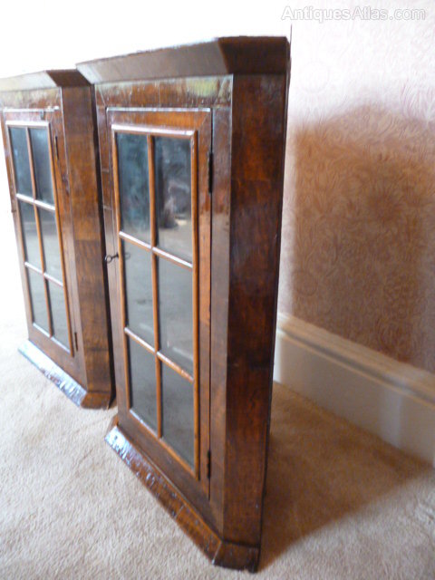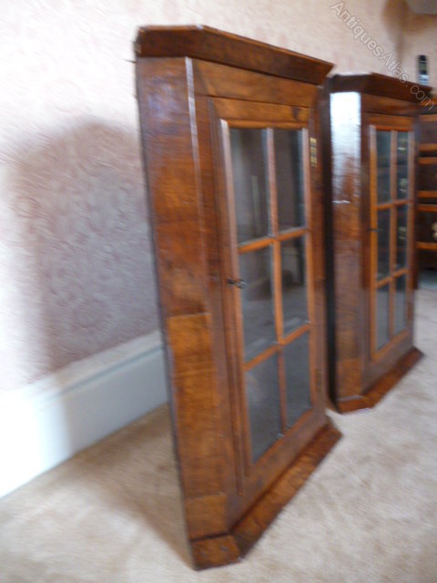 Lovely and rare to find a fine pair of walnut corner cabinets. These lovely cabnets are late Georgian. They are fully glazed and each cabinet has a key and working lock.