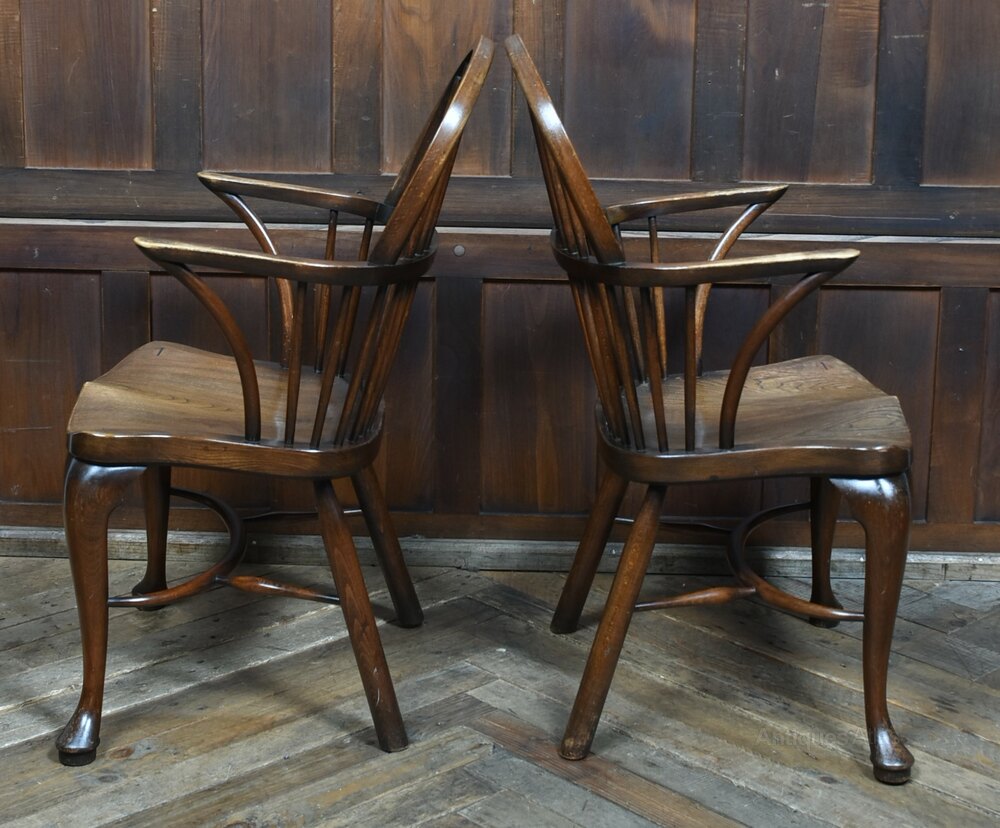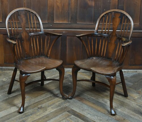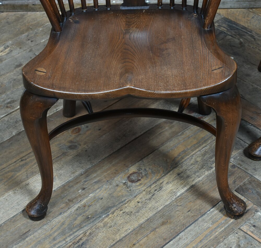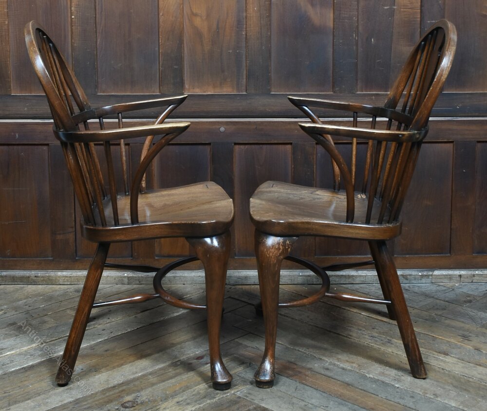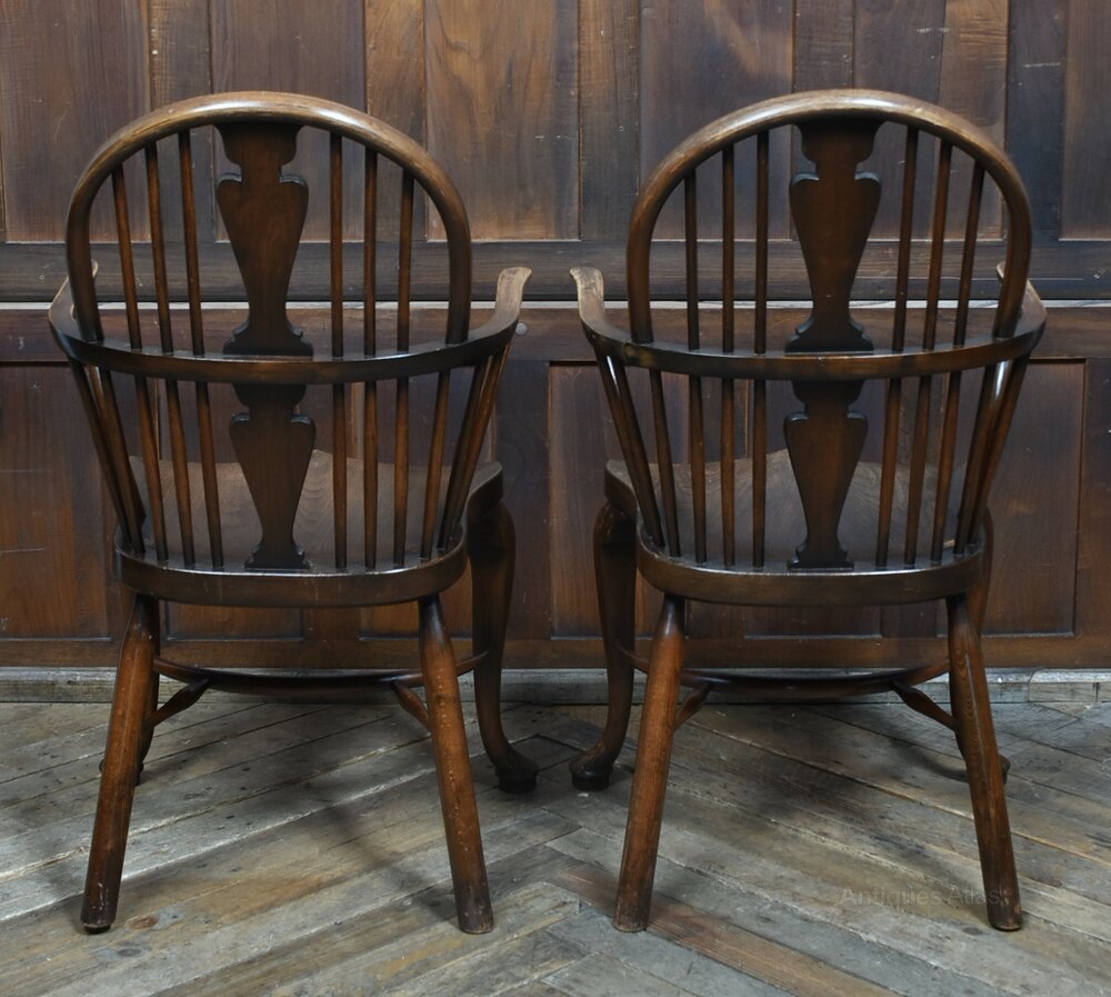 Wonderful pair of Windsor chairs in fabulous antique condition. These timeless pieces features gracefully hooped top rail and arms, supported by beautifully turned spindles, leading to a finely contoured saddle seat. The chair stands on elegant cabriole front legs and turned back legs, connected by a desirable crinoline stretcher for added stability and charm. As with all antique furniture, it carries minor imperfections that enhance its authenticity. With its solid construction, rich colouring, and lovely patina, these charming chair would make a perfect addition to a traditional or vintage-inspired setting.