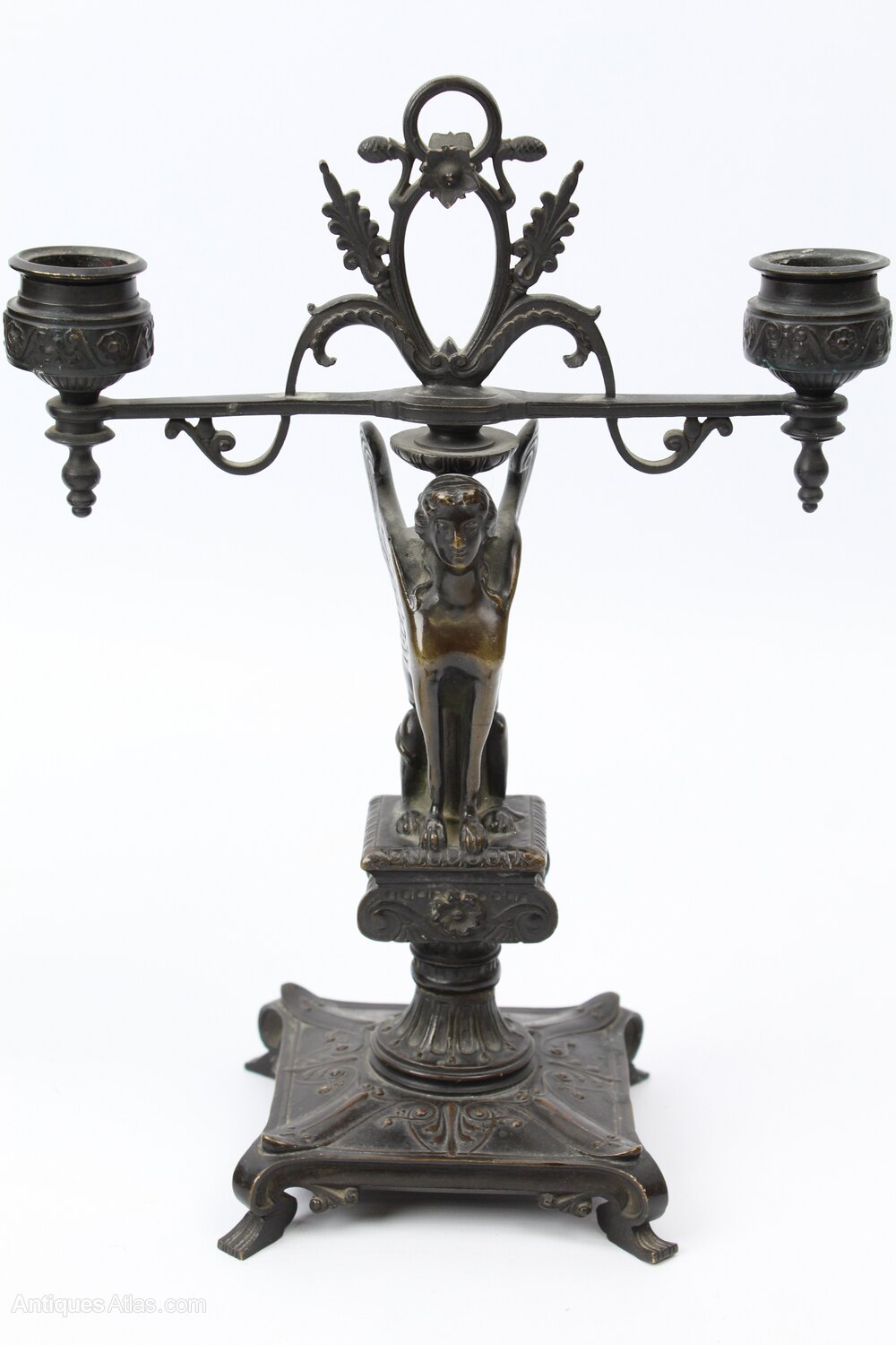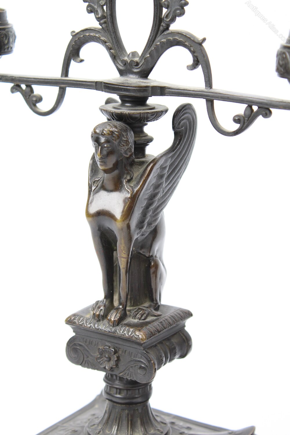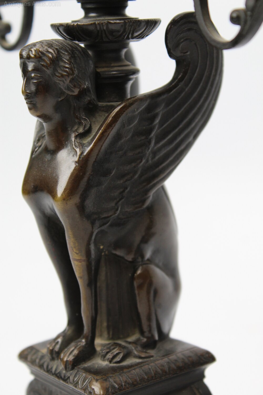 A fine pair of antique French Bronze two branch candelabra dating from circa 1830. In beautifully patinated bronze, decorated in neo-Pompeian style with a winged sphinx seated on a Corinthian seat above a waisted reeded socle ending on a square plinth base with four scrolled feet. Very good quality with wonderful colour and patination to the bronze.