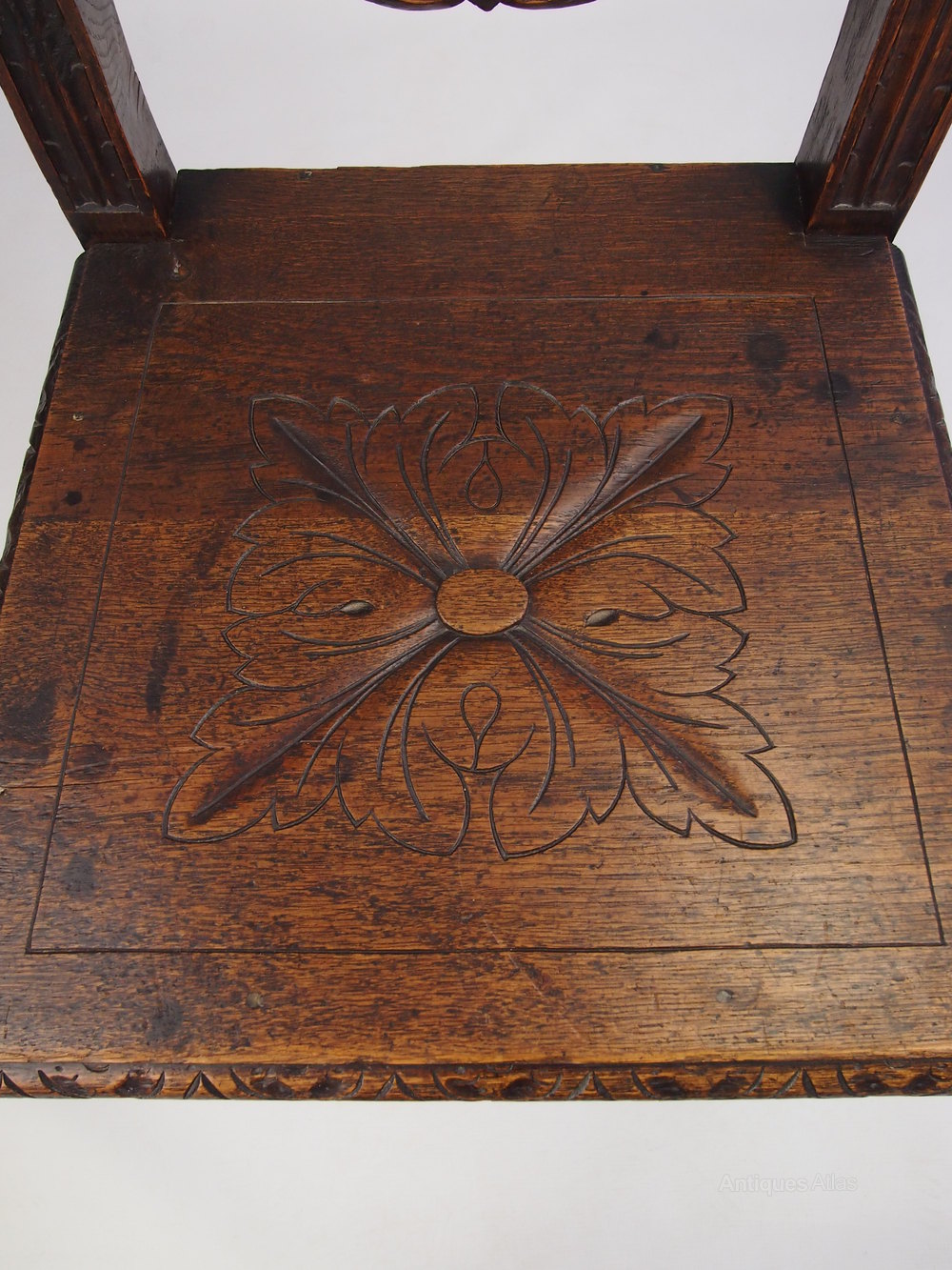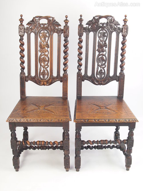 An attractively carved pair of antique Victorian Gothic chairs in dark oak. They have wonderfully carved backs with pierced central panels and a carved back rail of vine leaves and grapes. With barley twist side supports, topped with finials they stand on turned legs supported by turned cross stretchers. The solid seats also have carved details to them along with a few small splits. Some slight give to the chair frames. They have labels underneath which read "Thomas Taylor & Co House Furnishers Westgate Bradford".