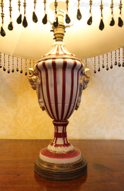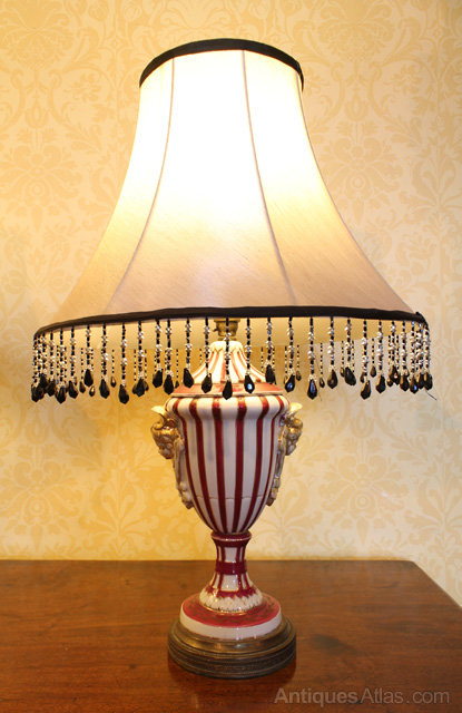 Pink and white stripe with gold detail, cherub masks and a heavy brass base c.1950. Excellent condition, re-wired and sold with a PAT test certificate.