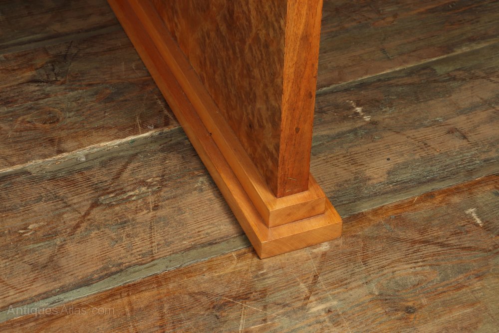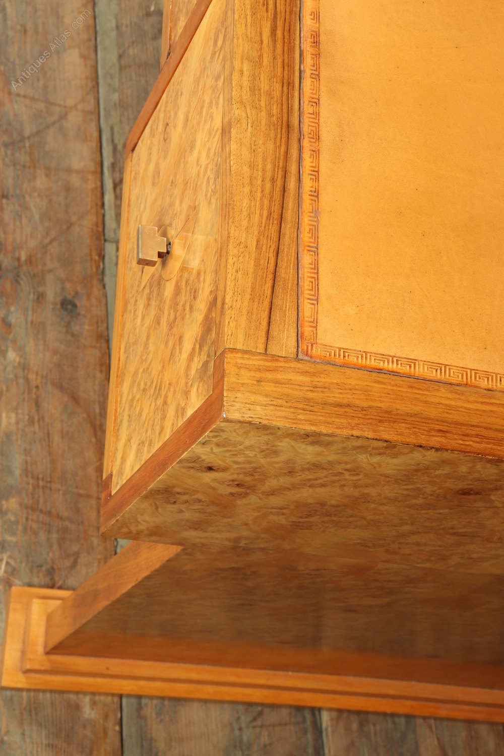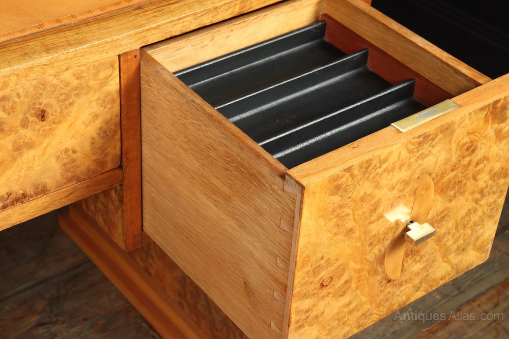 An exceptional quality Art Deco Desk produced in solid Oak and Walnut with Burr Maple veneers, thick Hyde Leather writing surface with greek key tooling, decorative inlaid escutcheons and long quality locks with keys.