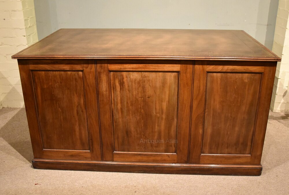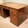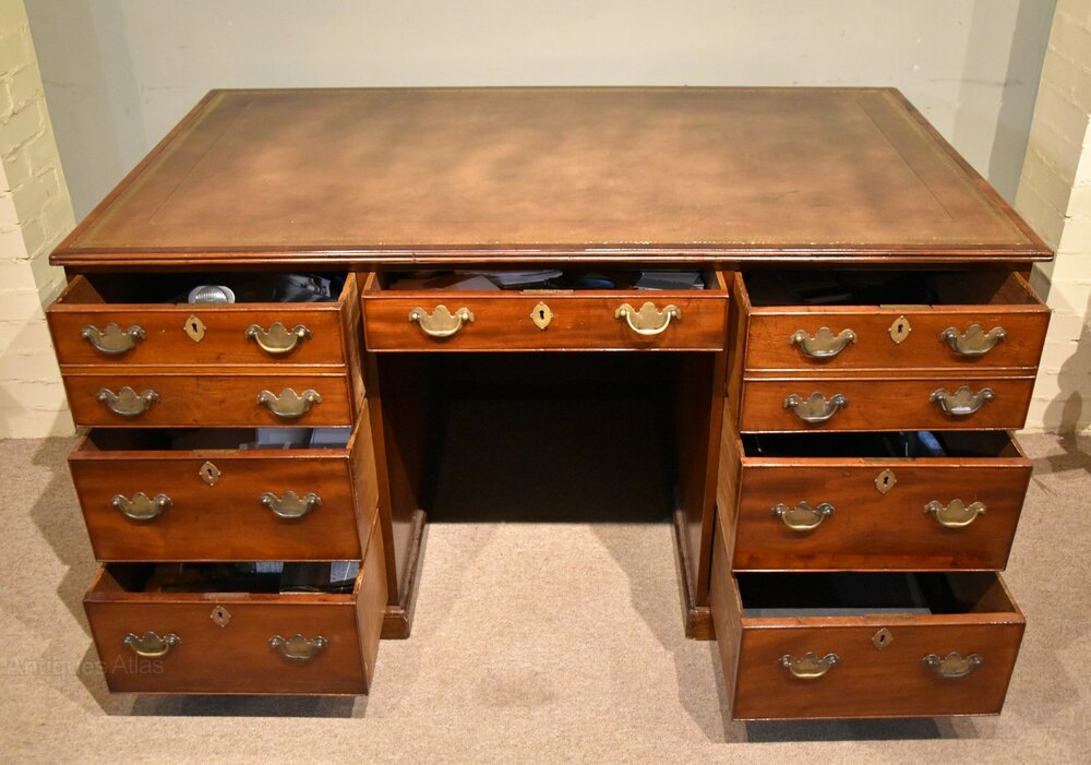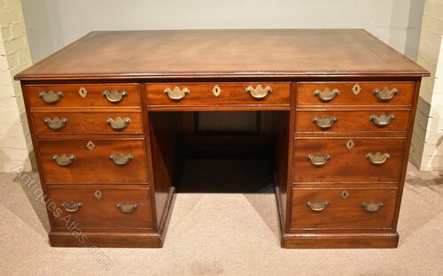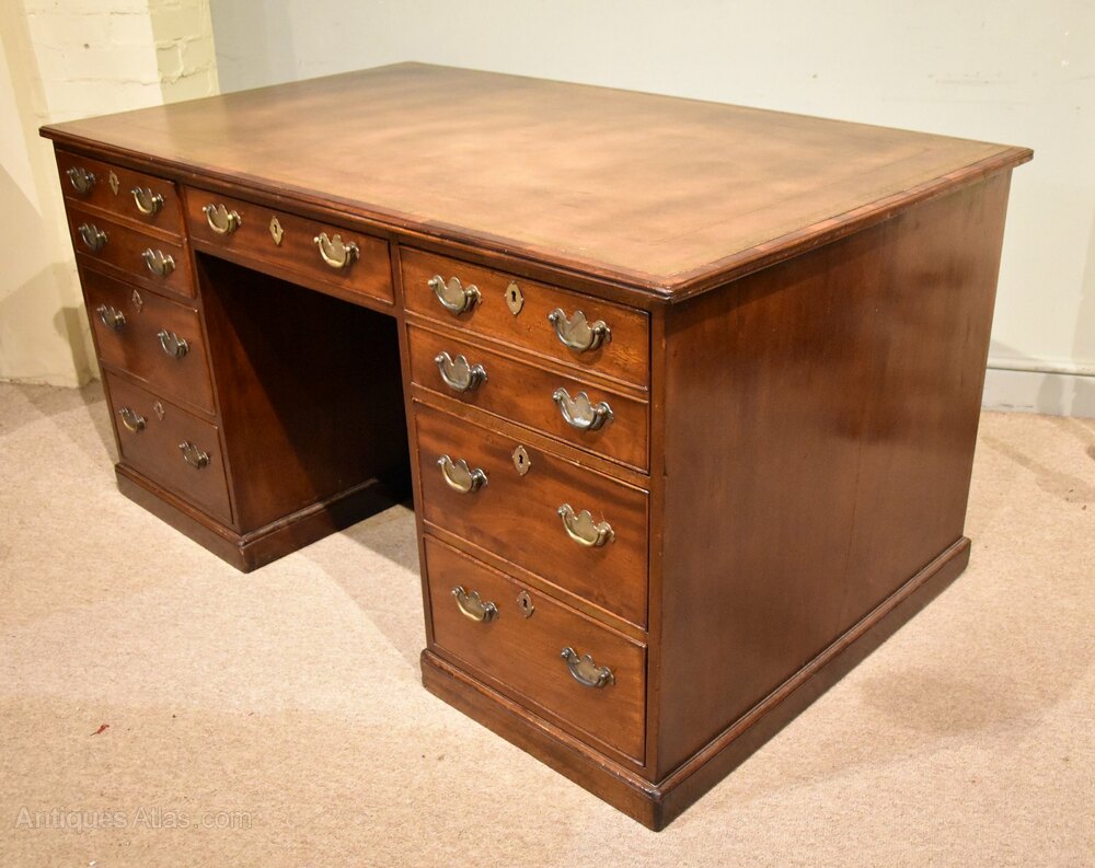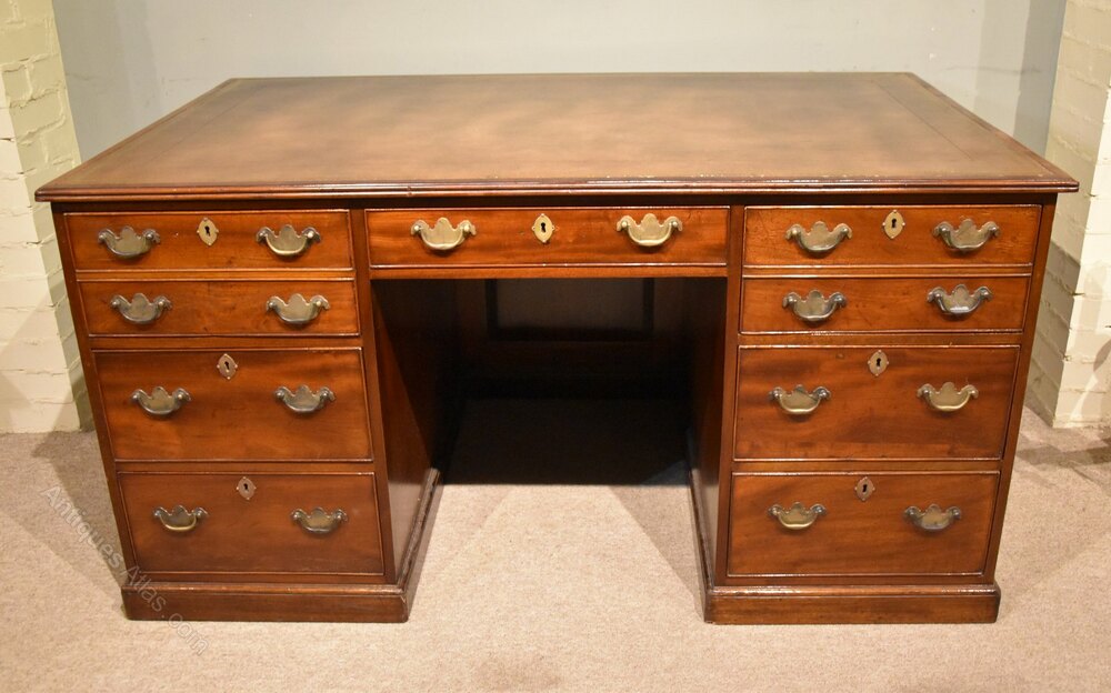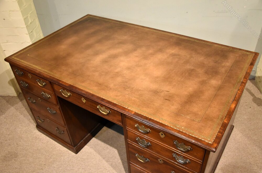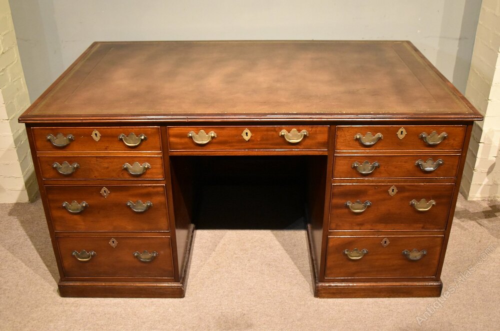 This gorgeous mahogany desk is in a classic Georgian style. A good mid 19th century mahogany pedestal desk in one piece. The desk has seven drawers with panel back and leather green top with later brass plate handles similar to the original.