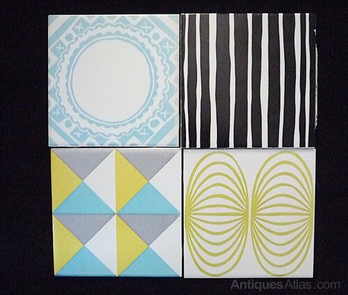 4 x mid century reclaimed glazed ceramic Carter tiles designed by Peggy Angus. All are in very good vintage condition with just a few rim nibbles to the zebra pattern and remnants of cement to the edges and on the back. No crazing. They measure 15.5 x 15.5cm although the zebra tile is deeper and heavier.