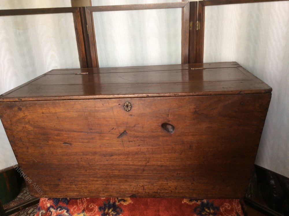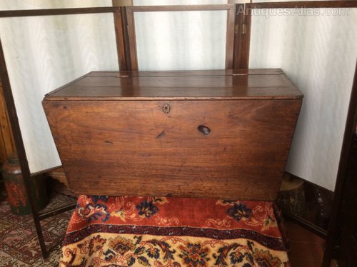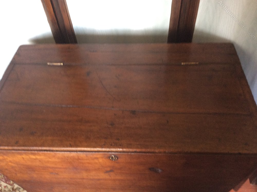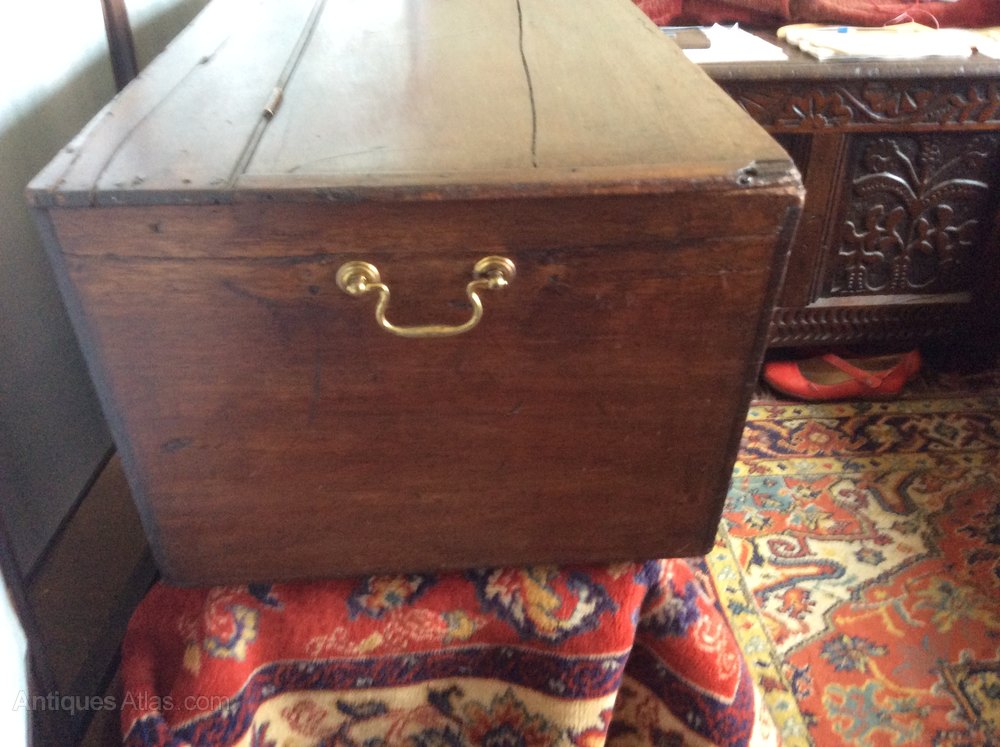 This Georgian travelling case is 16" deep x 29" wide tempering down to 25" and 13" high. Surmounted with brass handles made for use on a carriage useful for storage and display.