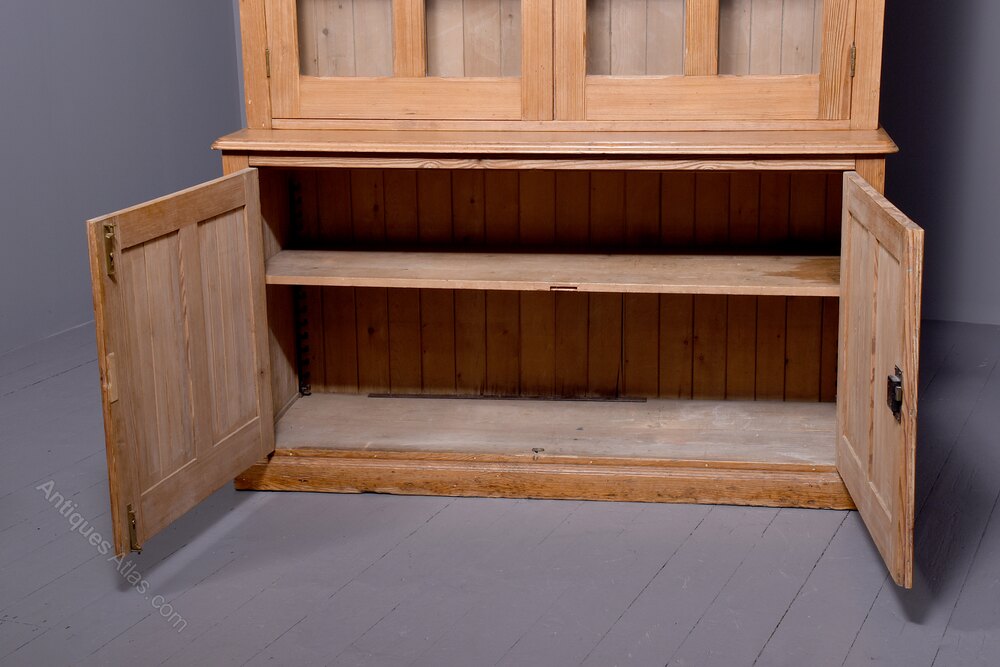 An unusual and stylish Victorian Aesthetic movement pitch pine two door cabinet bookcase, the top with a moulded cornice, with a pair of large double-glazed doors, with two glazing bars, inside with two adjustable shelves, the base with 2 double panel doors of ribbed pine, the gables are paneled and ribbed, the bookcase comes in two sections, all resting on an enclosed pitch pine base.