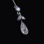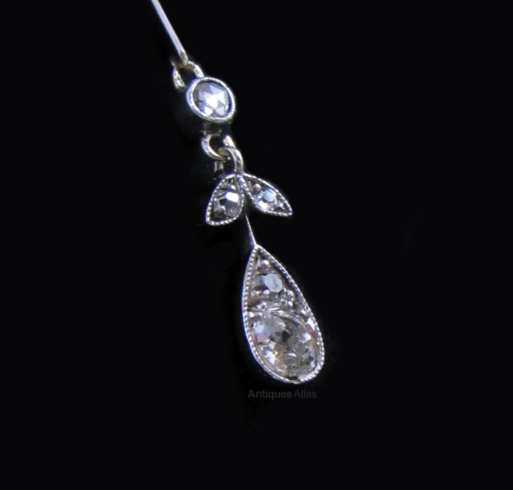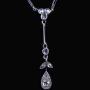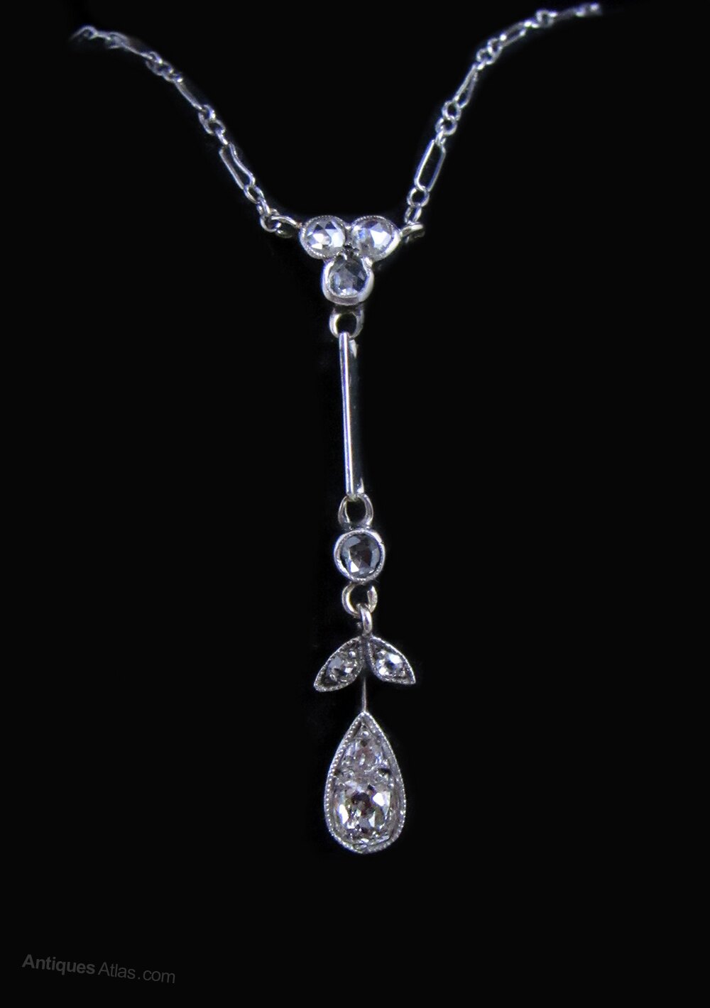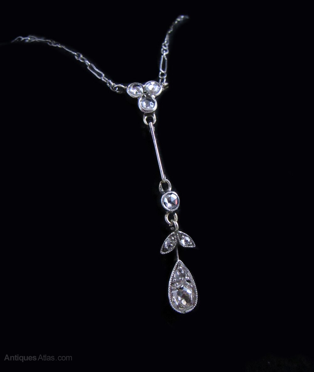 A very beautiful and finely made Art Nouveau pendant with original full platinum openwork chain and the platinum drop and petals set with seven old mine cut and rose cut natural diamonds and one large old mine cut natural diamond, all having wonderful clarity (colour H-J).