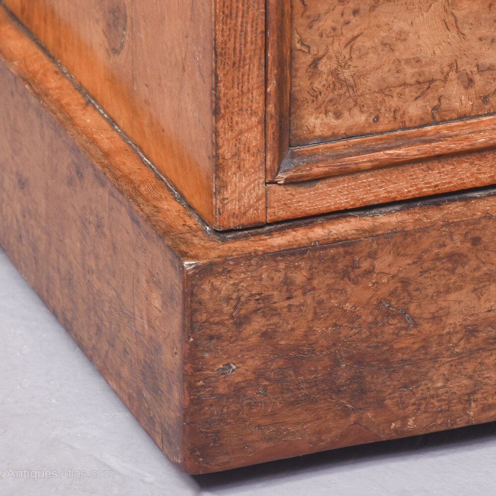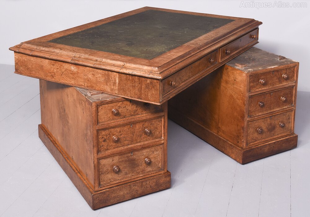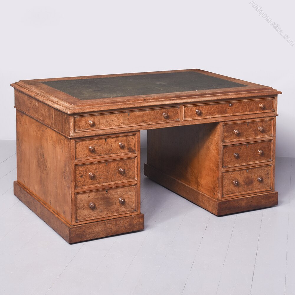 Antique Burr Walnut Leather Top Pedestal Desk