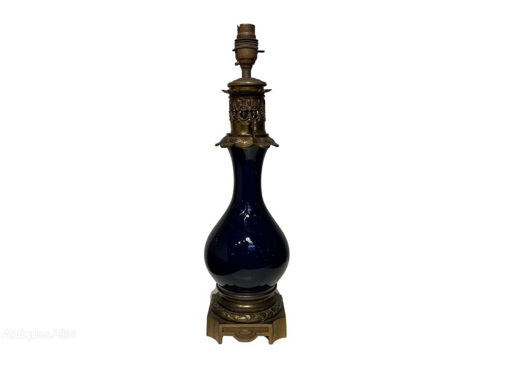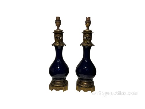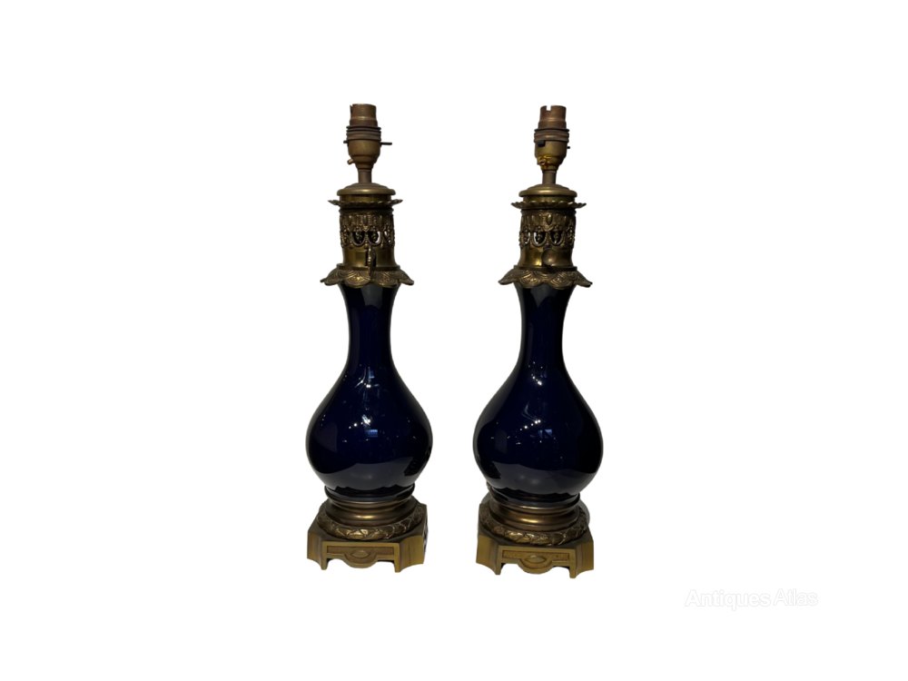 A pair of navy blue French porcelain oil lamps, professionally converted to electric lamps.