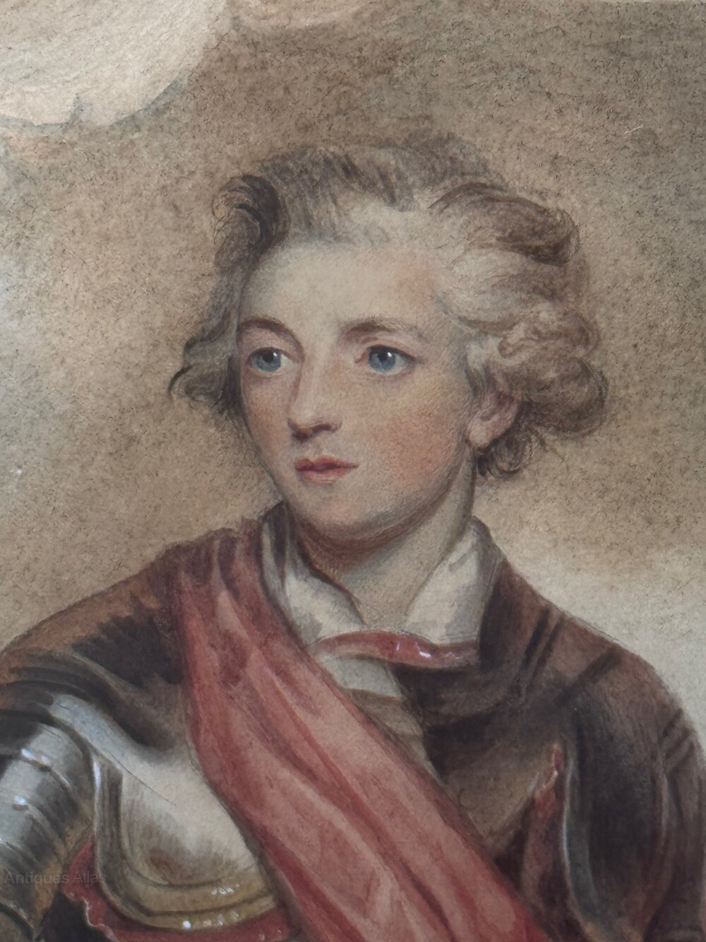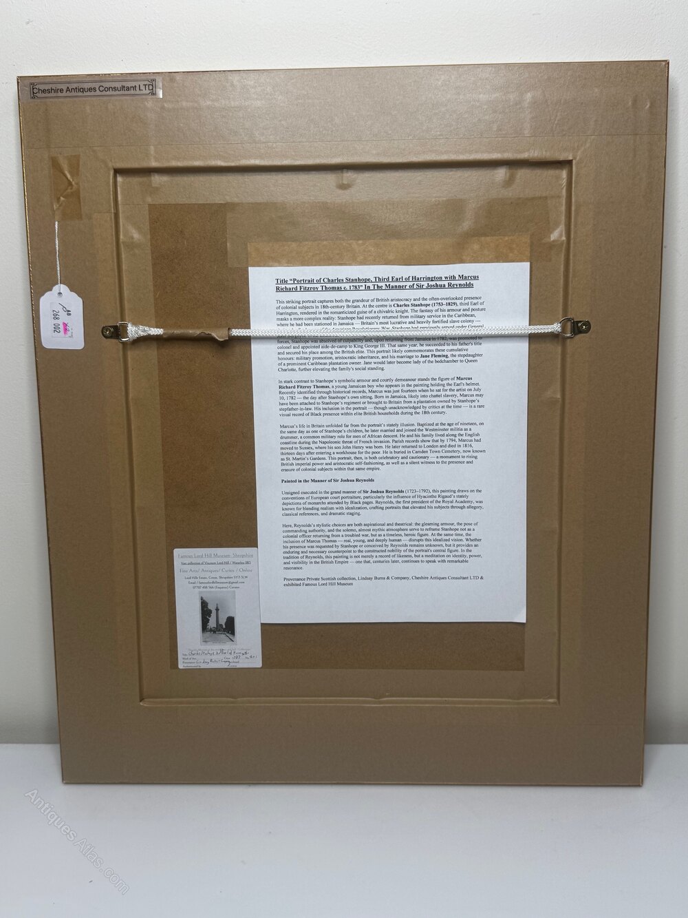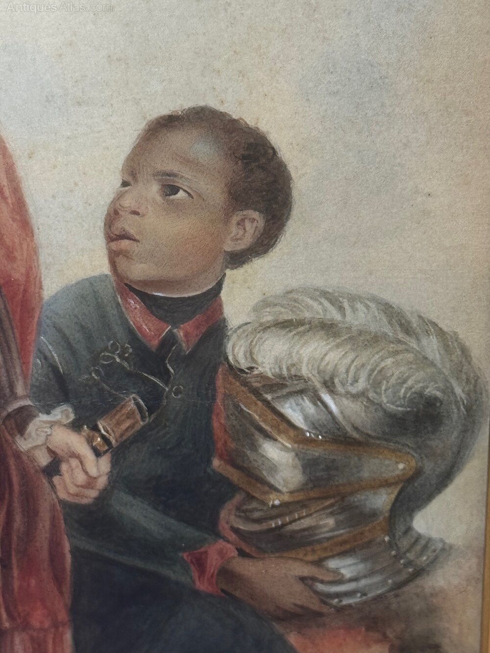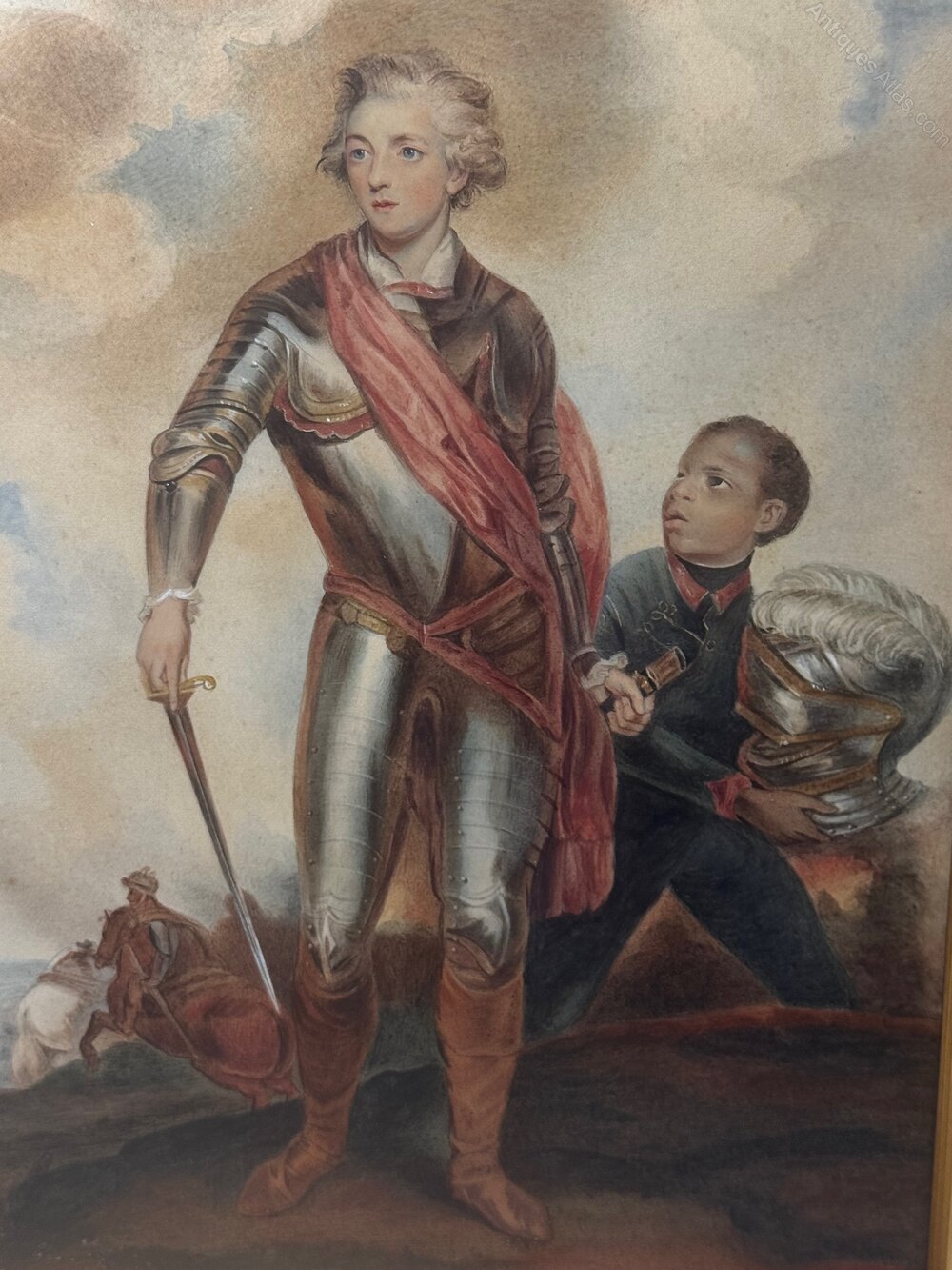 An exceptional and historically layered watercolour painting on paper, this portrait features Charles Stanhope, 3rd Earl of Harrington, in ceremonial armor, accompanied by Marcus Richard Fitzroy Thomas, a young Jamaican boy. Rendered in the Grand Manner tradition circa 1783 late 18th century, the painting fuses aristocratic display with colonial reality, making it not only visually striking but socially resonant.
