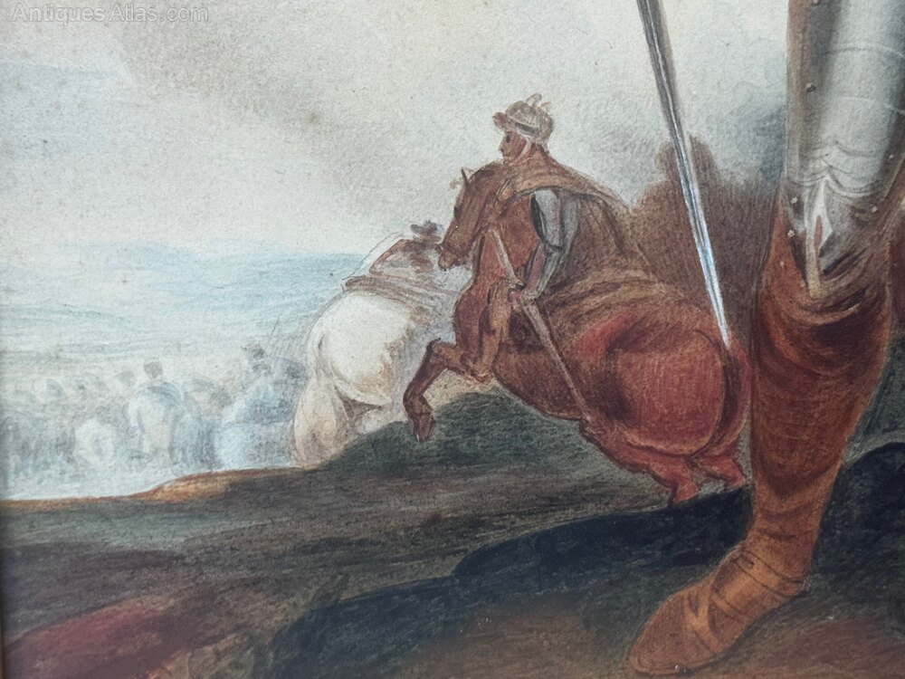 This painting is composed in the grand theatrical style associated with Sir Joshua Reynolds, yet the choice of watercolour lends it an unusual and delicate immediacy. Stanhope stands confidently at the center, clad in shimmering armor rendered in layers of cool blues, silvers, and soft greys, accented with a crimson sash. Behind him swirl dramatic skies in wet-on-wet washes of indigo, ochre, and smoky blue — evoking turbulence both literal and political.