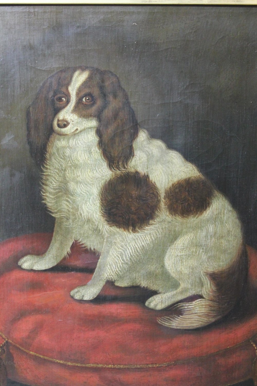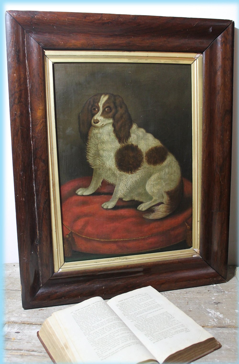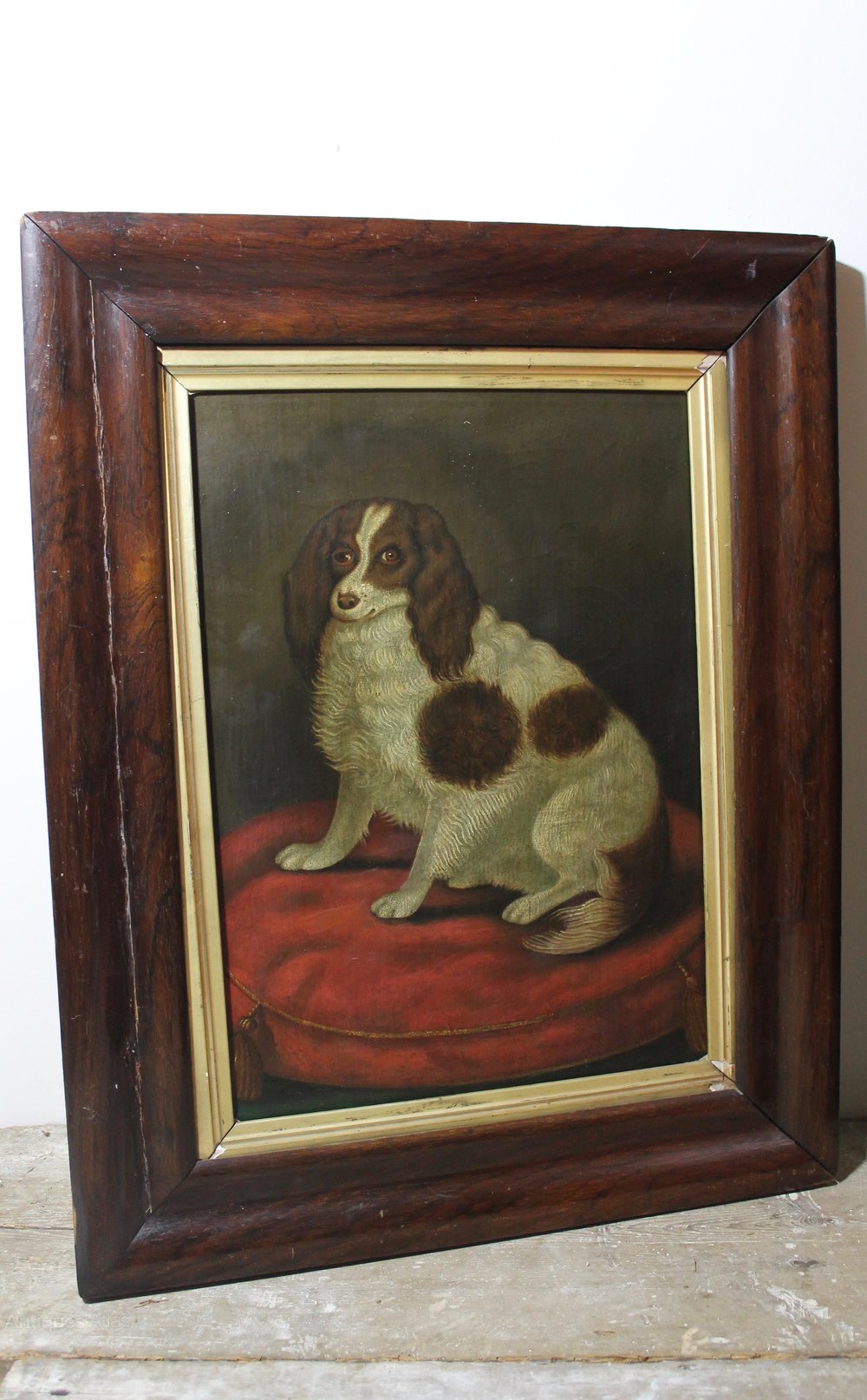 Portraits from the naive school often have an additonal charm. This oil on canvas study of a seated, rather plump, Cavalier King Charles Spaniel, would indeed fit into that category. Dating to c 1900 the Spaniel was obvioulsy favourite pet, his or her name, lost and forgotten. In a period faux rosewood frame with some losses.