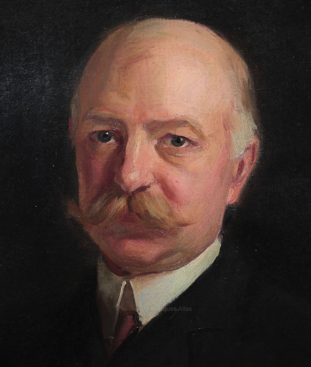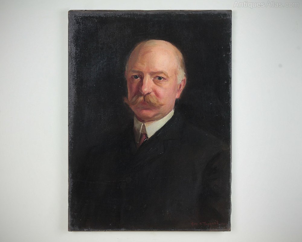 Fine Edwardian portrait in oil on canvas by the American artist George H. Taggart (1865-1924) dated 1905. Chest length portrait of an older gent with a steady gaze and impressive set of moustaches. Dressed in a black jacket and stiff white collar with a red neck tie. Lovely impressionistic brushwork to the face. Clearly signed and dated in the lower right hand corner. Very good condition, presented unframed on the original stretcher.