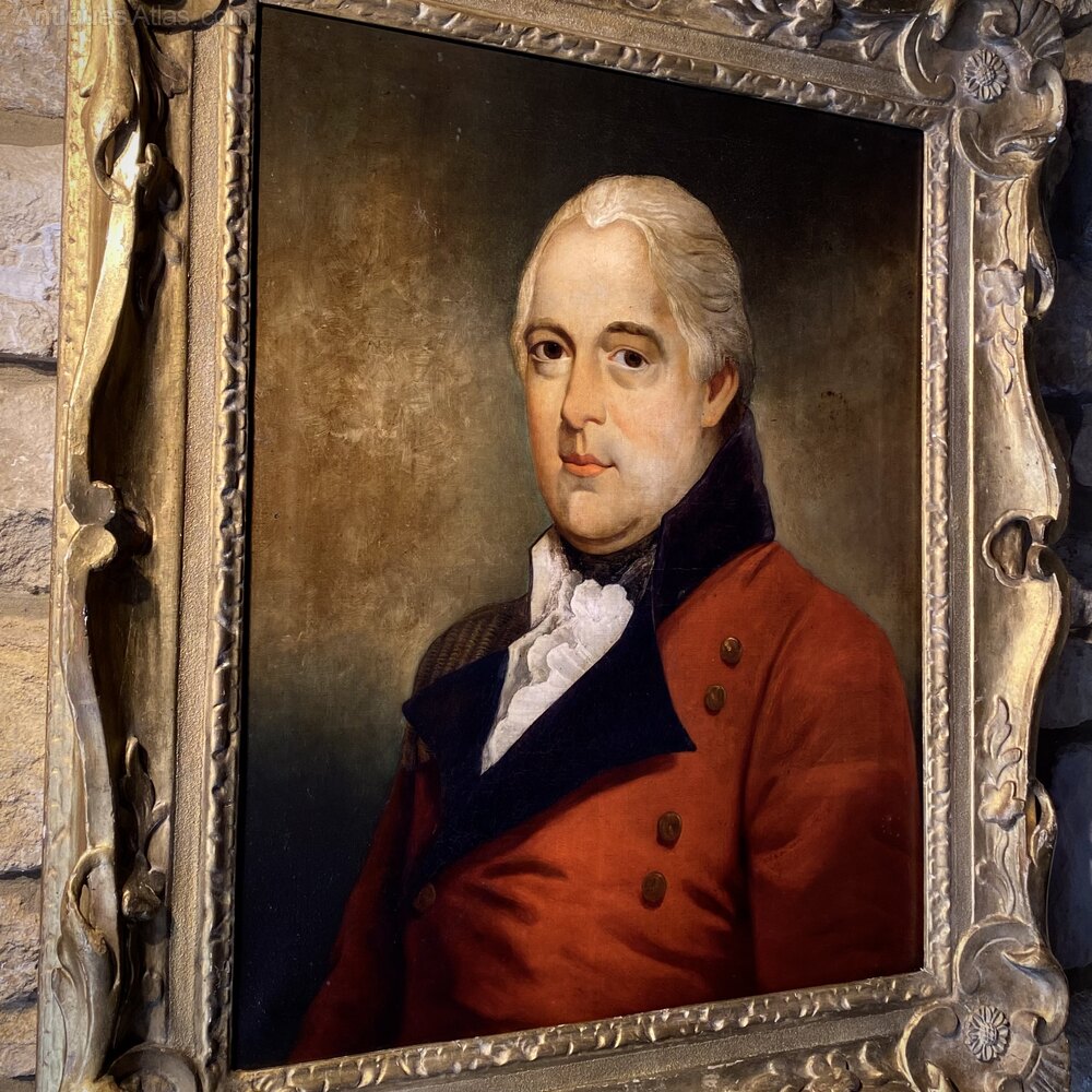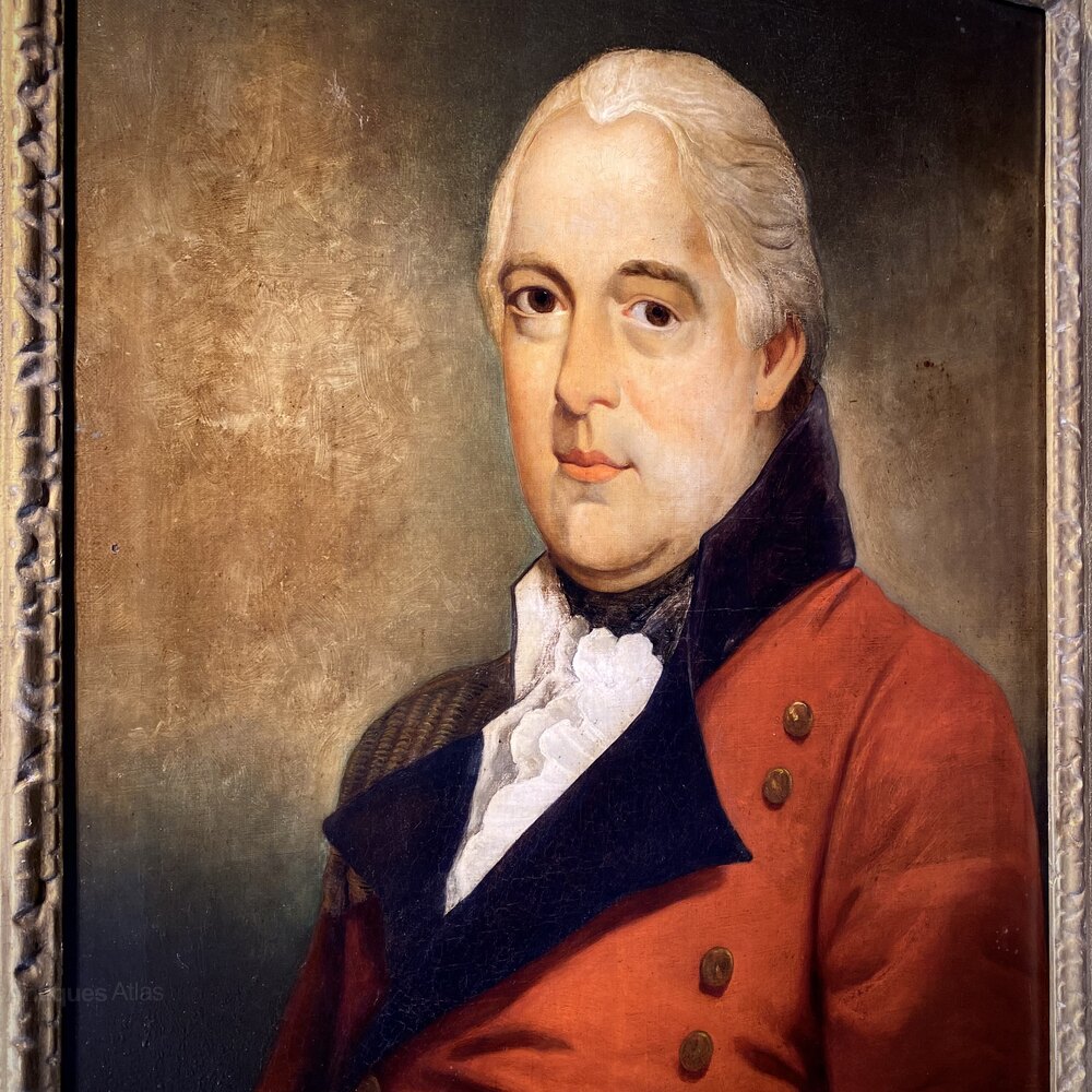 A fabulous portrait of an unknown gentleman, wearing a formal red uniform, and white cravat. Oil on canvas. Circa 1780.