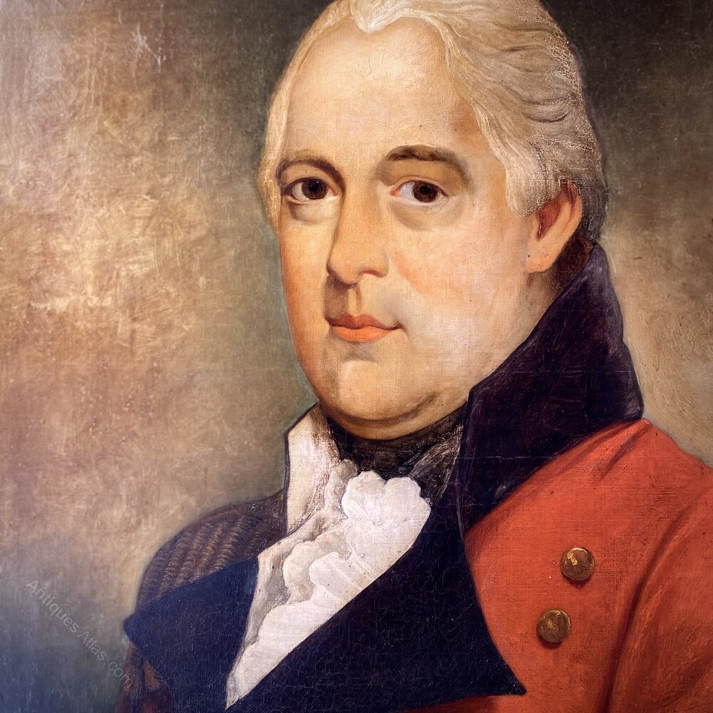 This fine oil on canvas portrait demonstrates expert techniques of utilising light and dark, much in the same style and manner as celebrated artist Joseph Wright (1734-1797). This wonderful mid-sized portrait features the sitter wearing a classic red uniform and white stock around his neck.