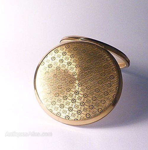 A gleaming gilt Stratton " Mini-Convertible " powder compact. The lid is decorated with gilt highly stylized floral motifs. The compact is in excellent condition. There isn't any loss of design. The lid opens to reveal a mirror which gives a good and accurate reflection. All clasps and hinges work perfectly. The powder well is lined with a pristine waxed paper insert. The base is decorated with a design the makers named the " Woven effect " & signed " Stratton ENGLAND ". Measures 3 " & weighs 71.5 grams.