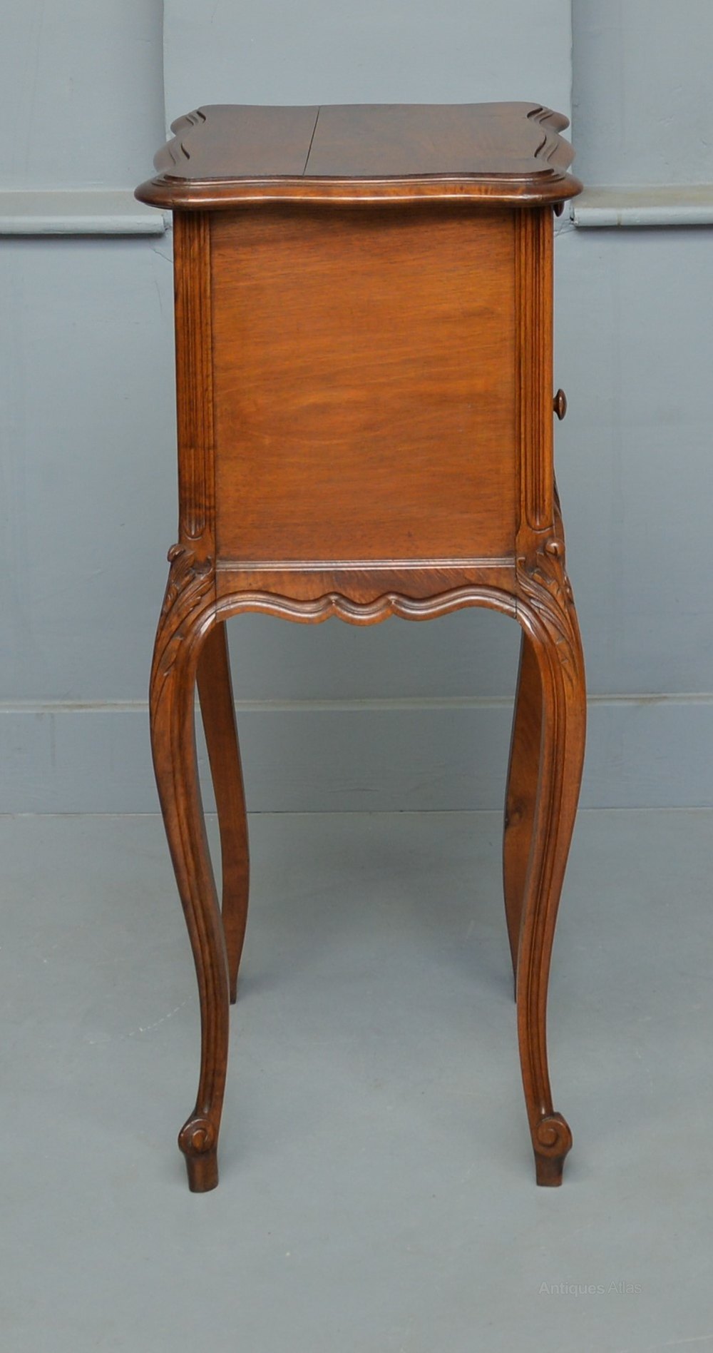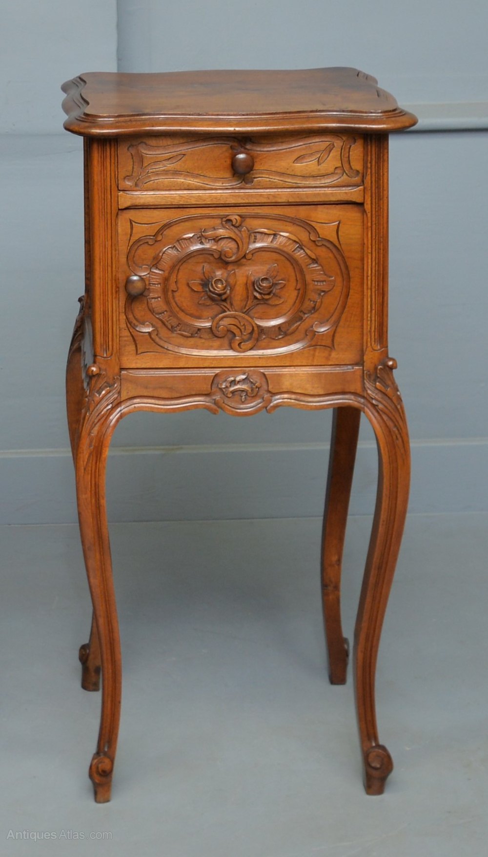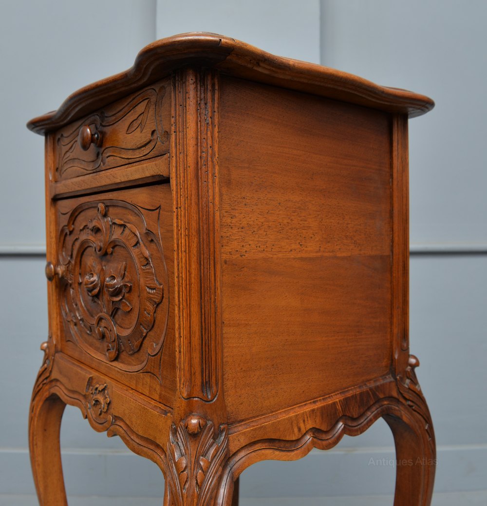 Constructed from walnut in the Rococo style. Having a serpentine shaped moulded edge top. Below is a single drawer over a cabinet door, having pretty floral and shell carvings to the front.