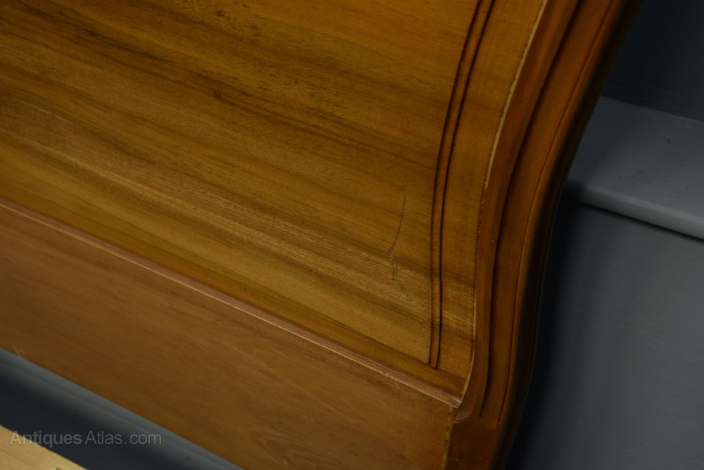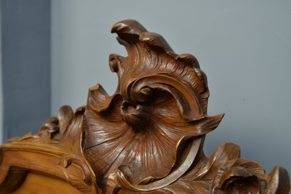 Made of walnut, having a lovely curvaceous serpentine shaped head and footboard, with very finely carved shell, fruit and scroll motifs.