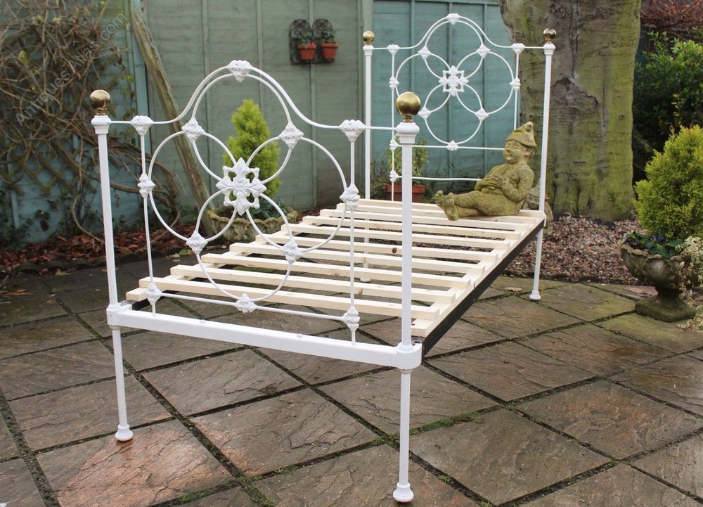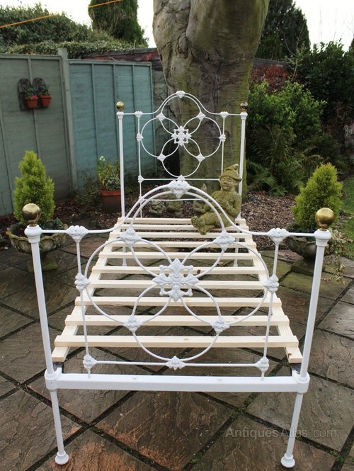 This is a very pretty Victorian period cast iron single bed in super order. The bed dates from around 1850 and has a most attractive design to the high head and base boards. The original solid brass knobs are in good order and the bed retains its original tight fitting side irons. It comes with a practical timber latt base so simply requires a standard single mattress. The bed measures 132 cms high at the head and 110 cms high at the base and is 200 cms in length overall.