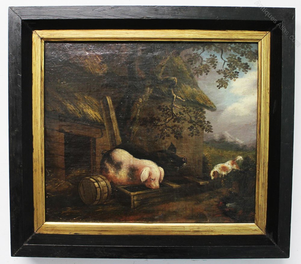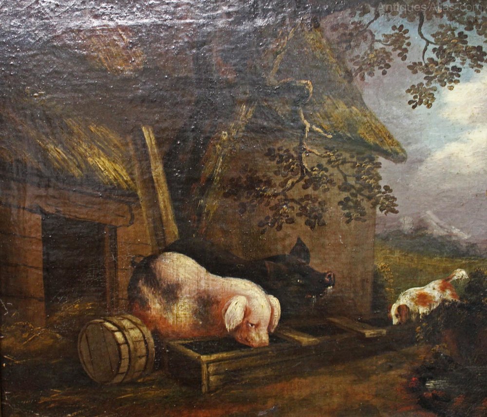 Primitive farmyard painting of pigs. George Morland