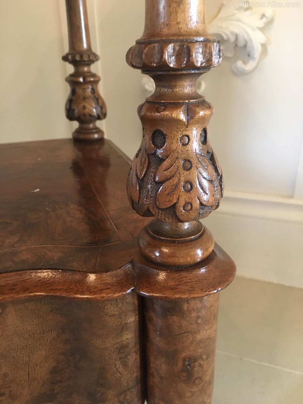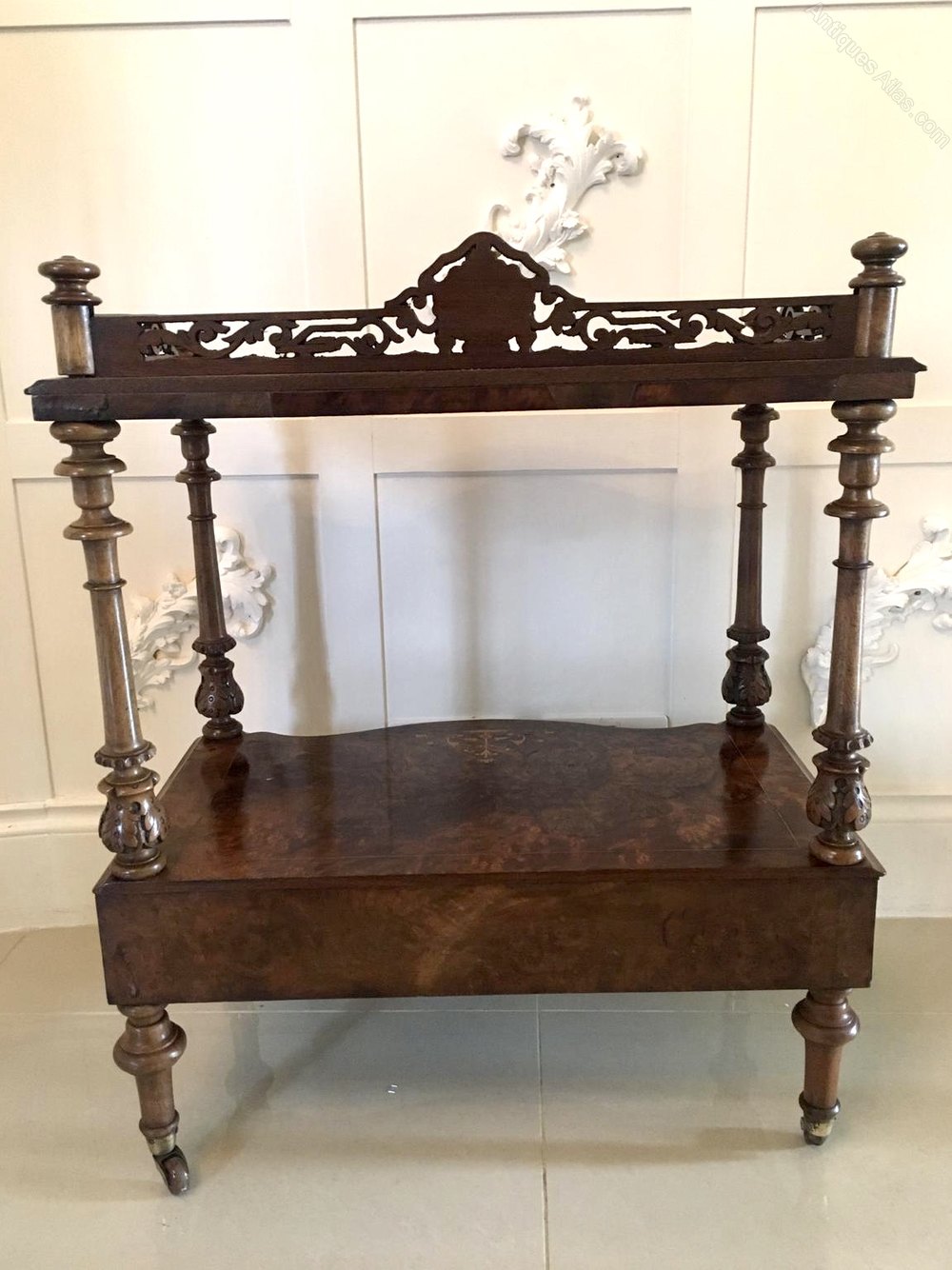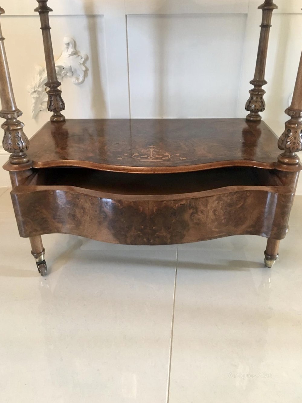 Quality antique Victorian Burr Walnut Inlaid Whatnot having a pretty carved pierced inlaid gallery and a splendid burr walnut inlaid serpentine shaped top. It is raised on 4 elegantly shaped carved turned solid walnut columns with a very attractive burr walnut inlaid serpentine shaped under tier, below it boasts one long burr walnut serpentine shaped drawer. It stands on 4 turned walnut feet and has original castors.