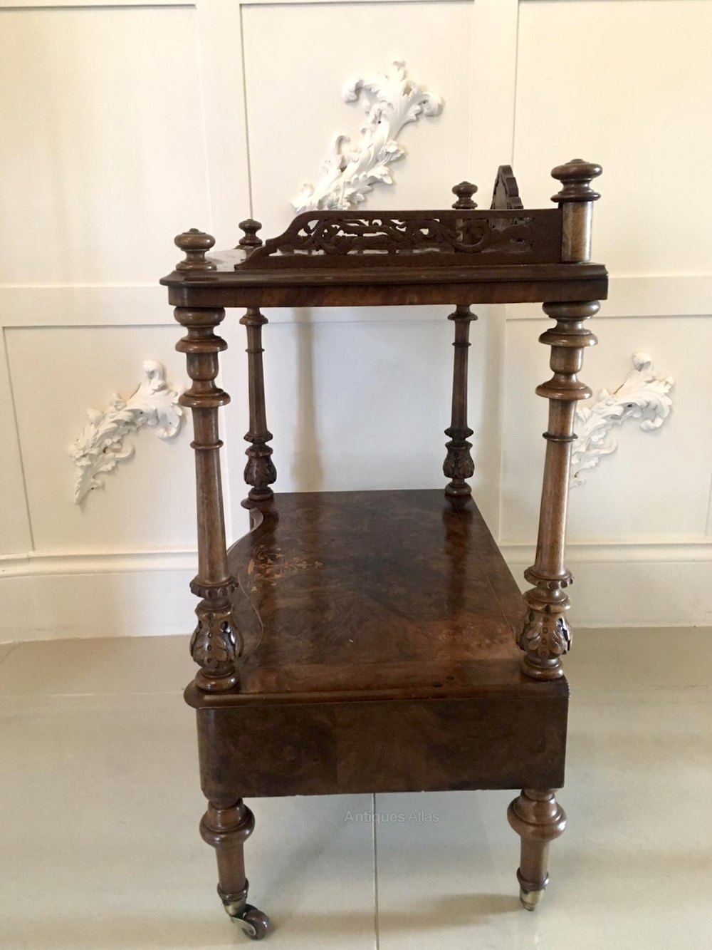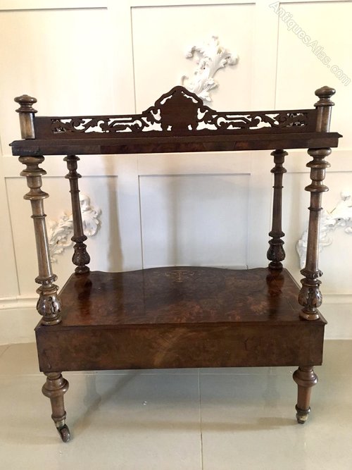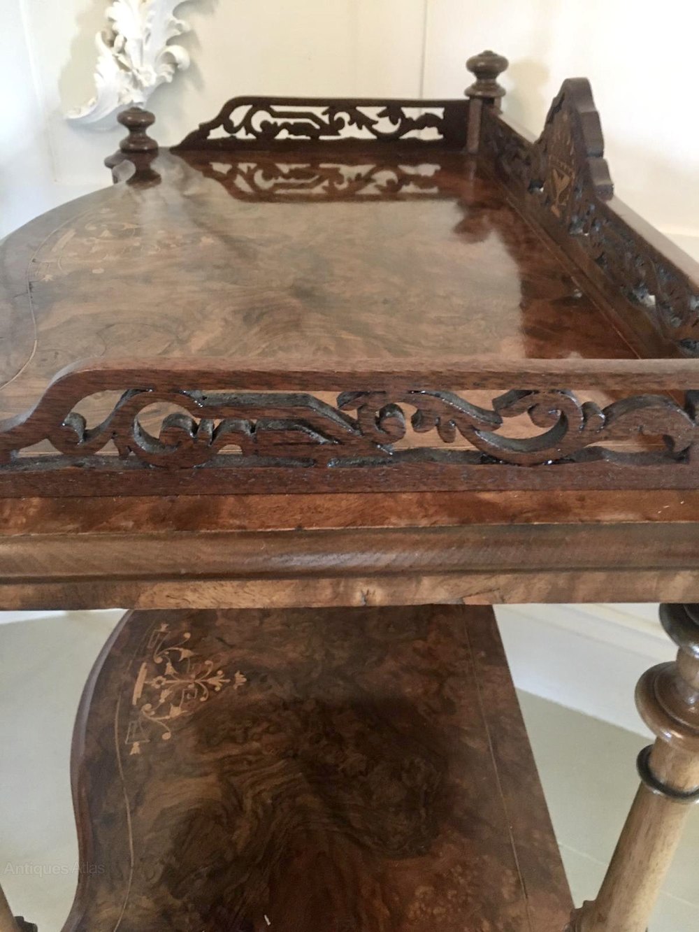 Quality antique Victorian Burr Walnut Inlaid Whatnot having a pretty carved pierced inlaid gallery and a splendid burr walnut inlaid serpentine shaped top. It is raised on 4 elegantly shaped carved turned solid walnut columns with a very attractive burr walnut inlaid serpentine shaped under tier, below it boasts one long burr walnut serpentine shaped drawer. It stands on 4 turned walnut feet and has original castors.