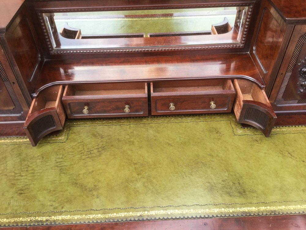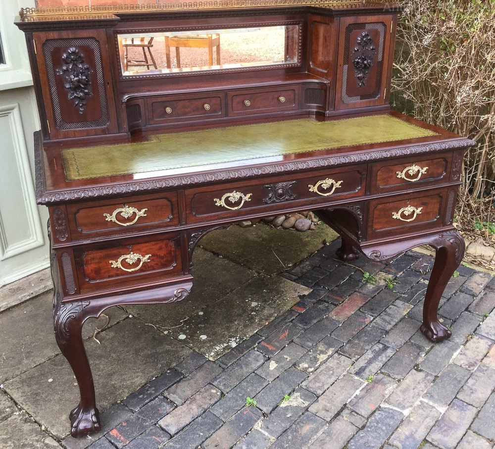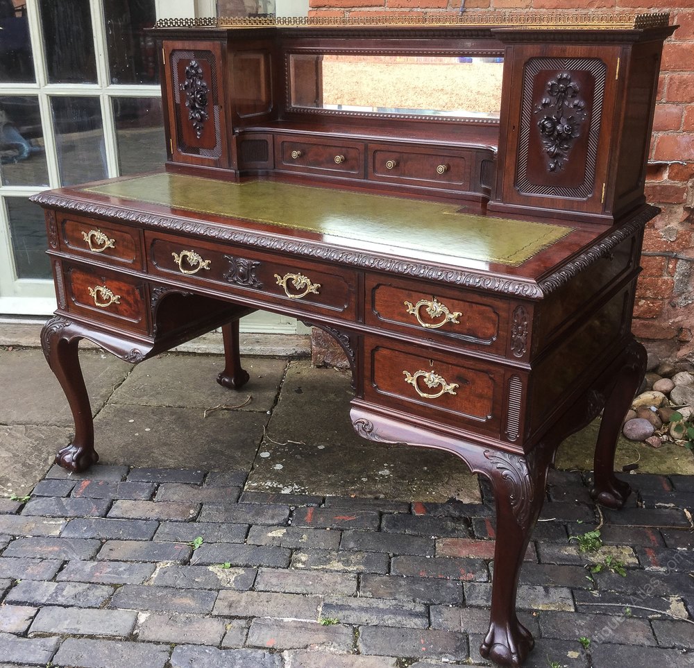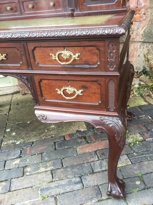 A Very good Quality Writing Desk in Mahogany, the base section has five drawers while the upper section has two drawers two cupboards and two small corner drawers, it stands on bold cabriole legs with ball and claw feet to both the front and back, it has a brass gallery to the very top of the back. Thnis is a very heavy quality desk in excellent condition.