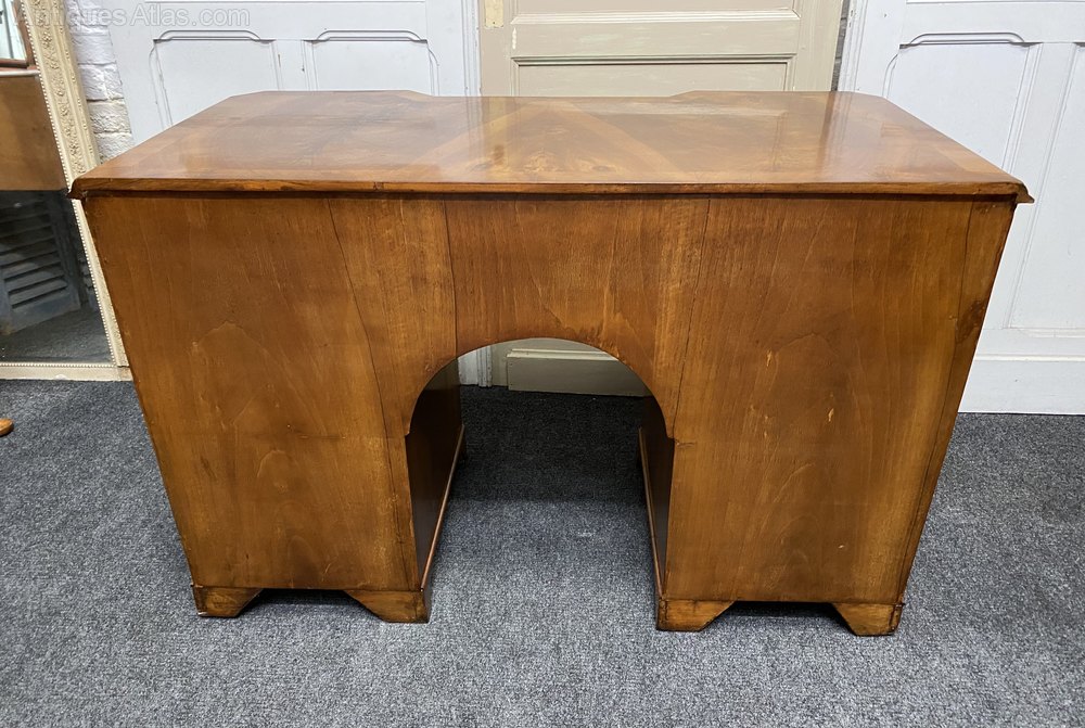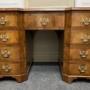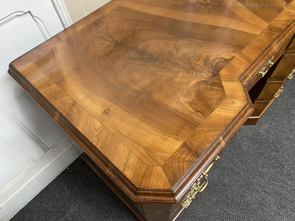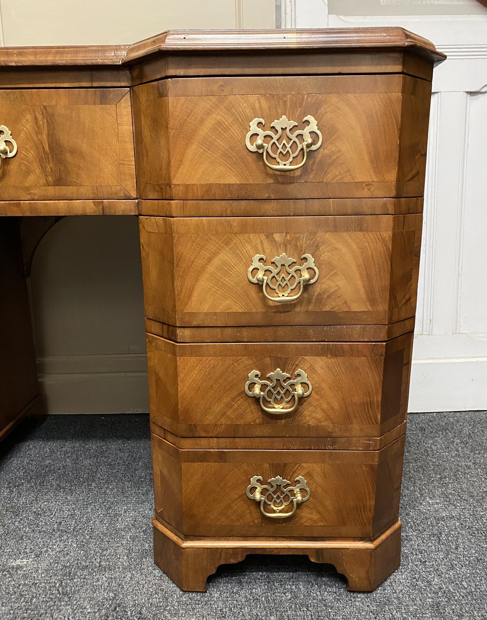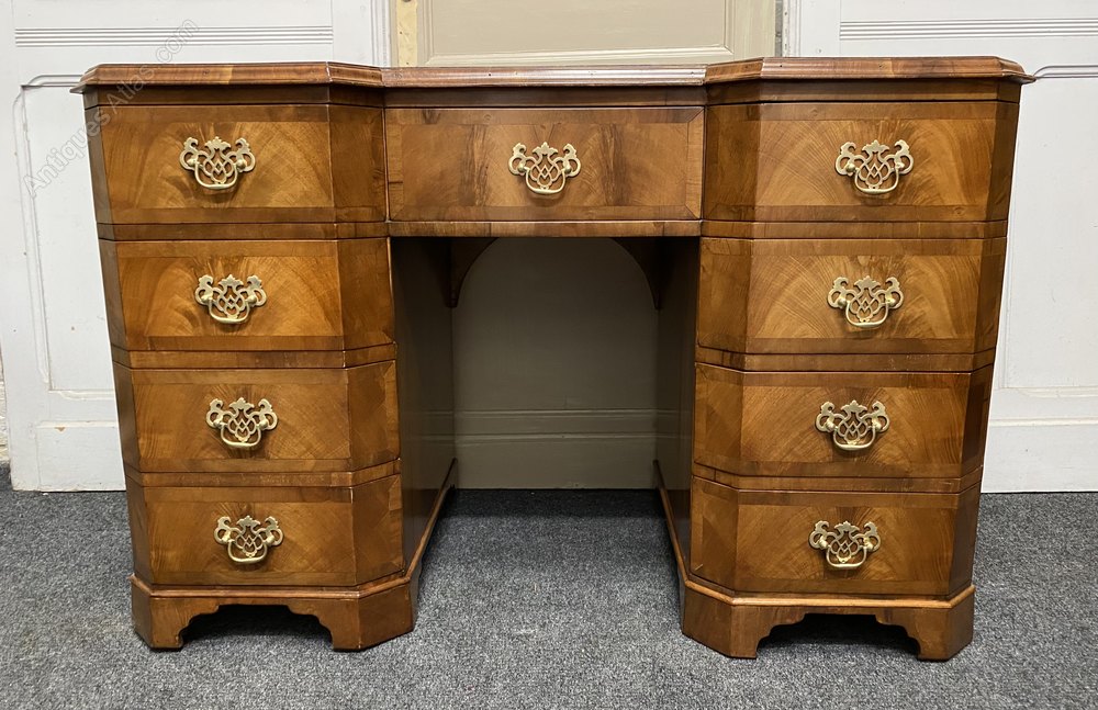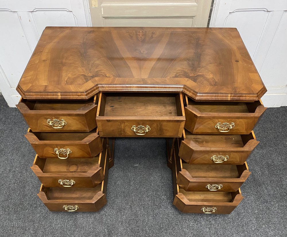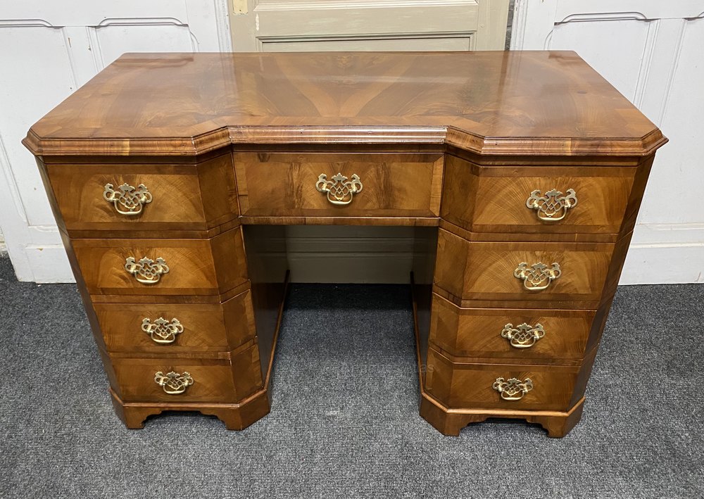 A lovely quality Walnut Pedestal Office 9 Drawer Desk. Nice inverted shaped front, all the drawers run smoothly fitted with original handles.