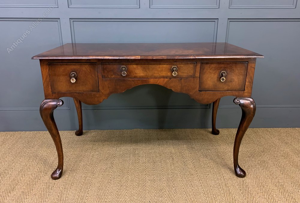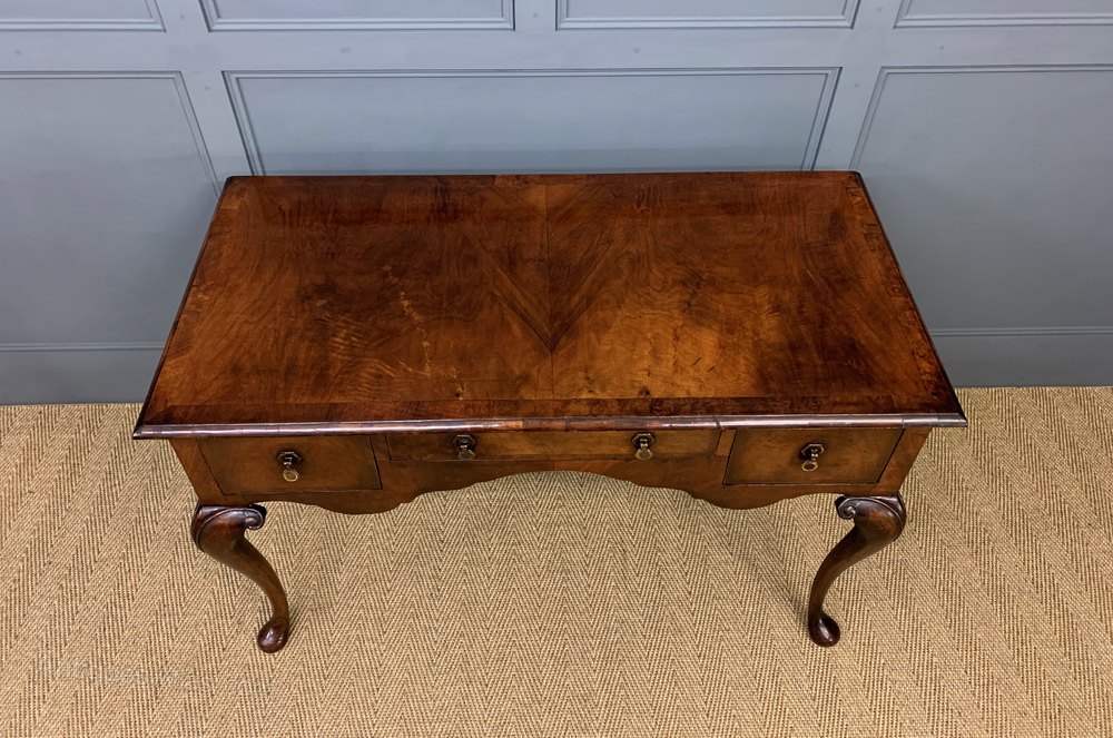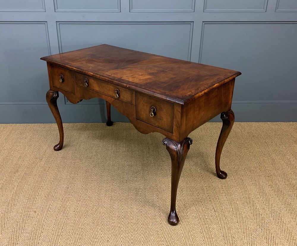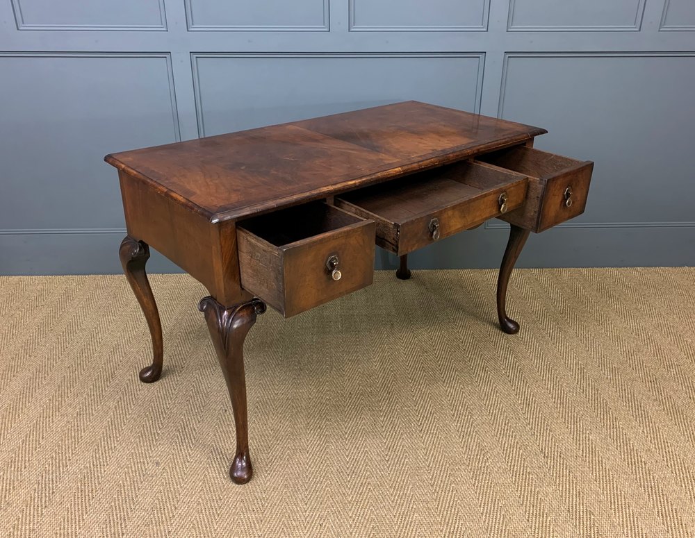 A lovely queen Anne style burr walnut side, or dressing table. Well constructed in solid walnut with attractive burr walnut veneers. The rectangular top is cross banded and sits over an arrangement of 3 drawers. All standing on elegant cabriole legs. Offered for sale in excellent overall condition, ready to go straight into the home.